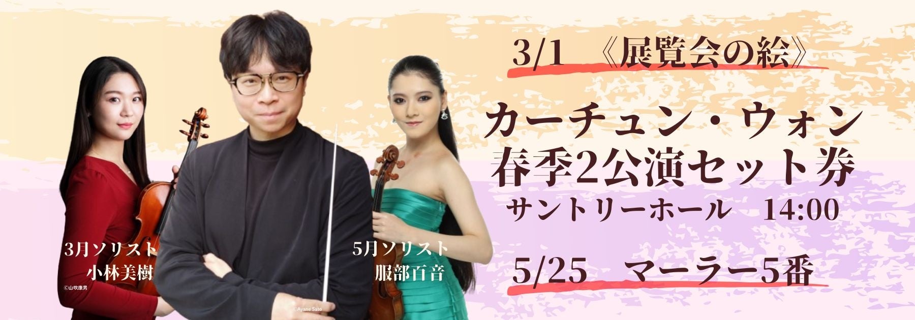 マーラー国際指揮者コンクールの覇者であり、マーラーに特別な想いを寄せるカーチュン・ウォンの注目の公演を、いちはやく、そして最もお得に聴けるセット券(S席及びA席限定)です。サントリーホールの最上席で、旬の指揮者が最も得意とするプログラムを5,000円代で聴ける!またとないチャンス。ソリストにも、人気・実力ともに日本を代表するヴァイオリニスト、小林美樹(3月)と服部百音(5月)を迎えます。両者の熱演にも、どうぞご期待ください。