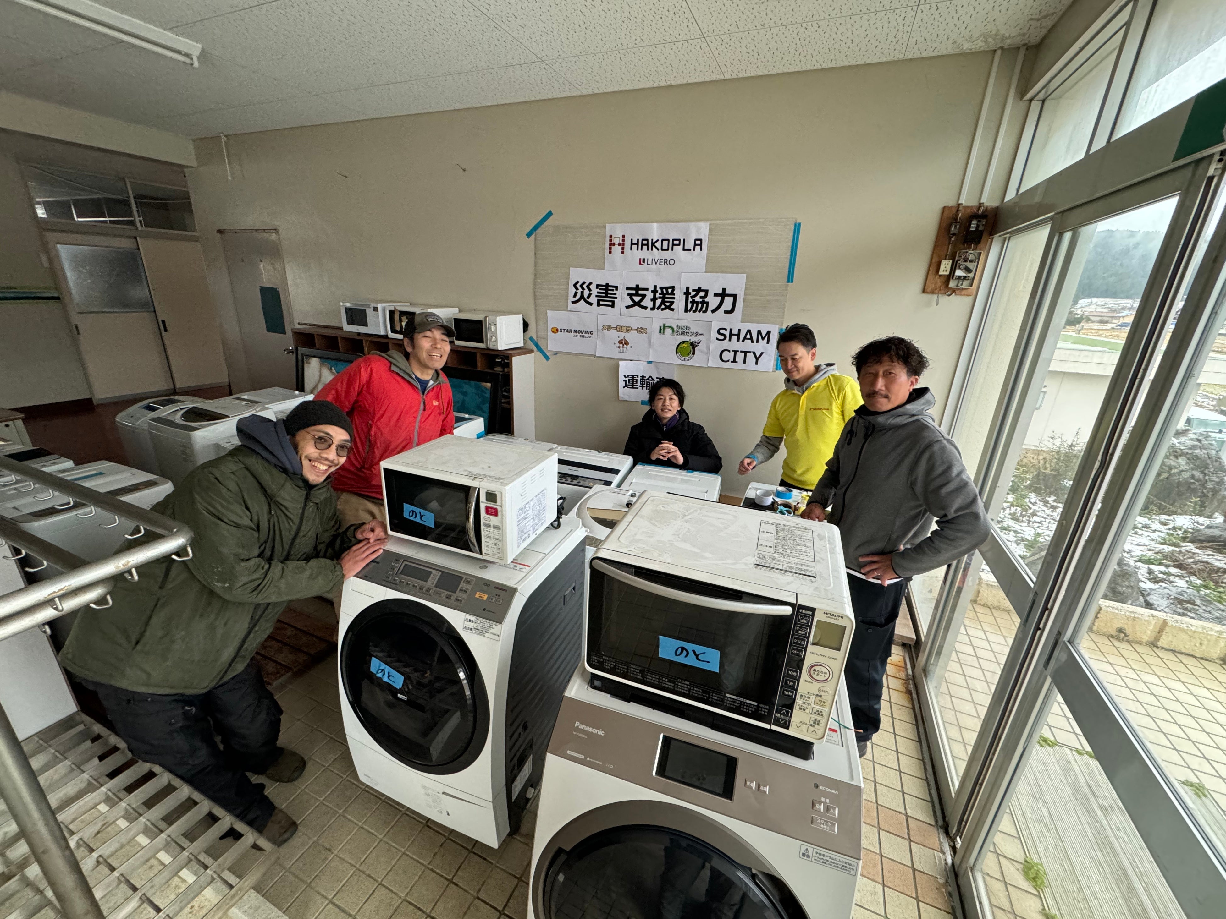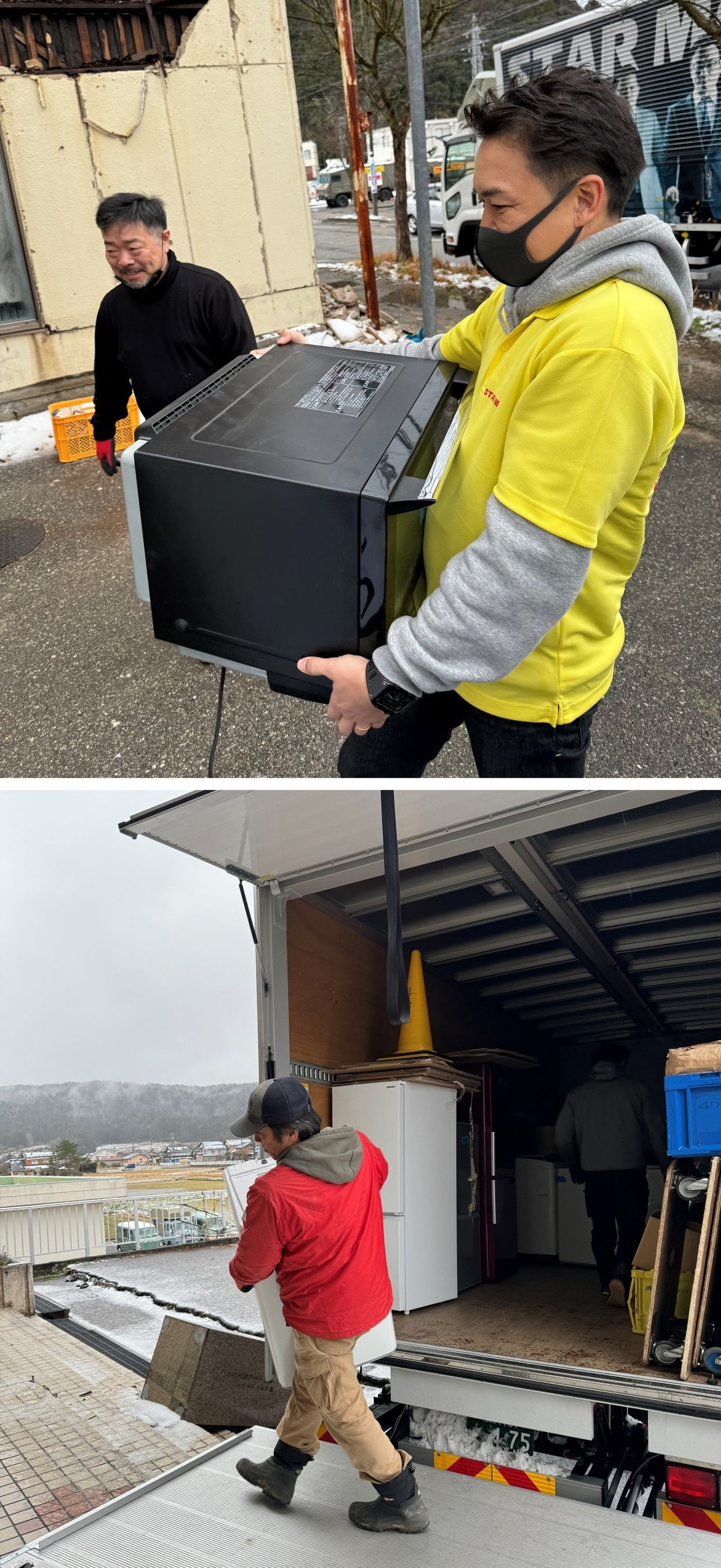 また今回の支援活動に合わせて前回、福岡での災害支援要請をいただいた一般社団法人『ロハス南阿蘇たすけあい』からも石川県鳳至郡穴水町への物資提供の要請をいただきました。1か所目、石川県七尾市にある旧西岸小学校へ電子レンジ6台、洗濯機24台を、2か所目、穴水町の一時物資集積所、航心丸へ電子レンジ3台、冷蔵庫3台を運搬・提供。提供した支援物資はそれぞれの団体から被災者へ渡されます。