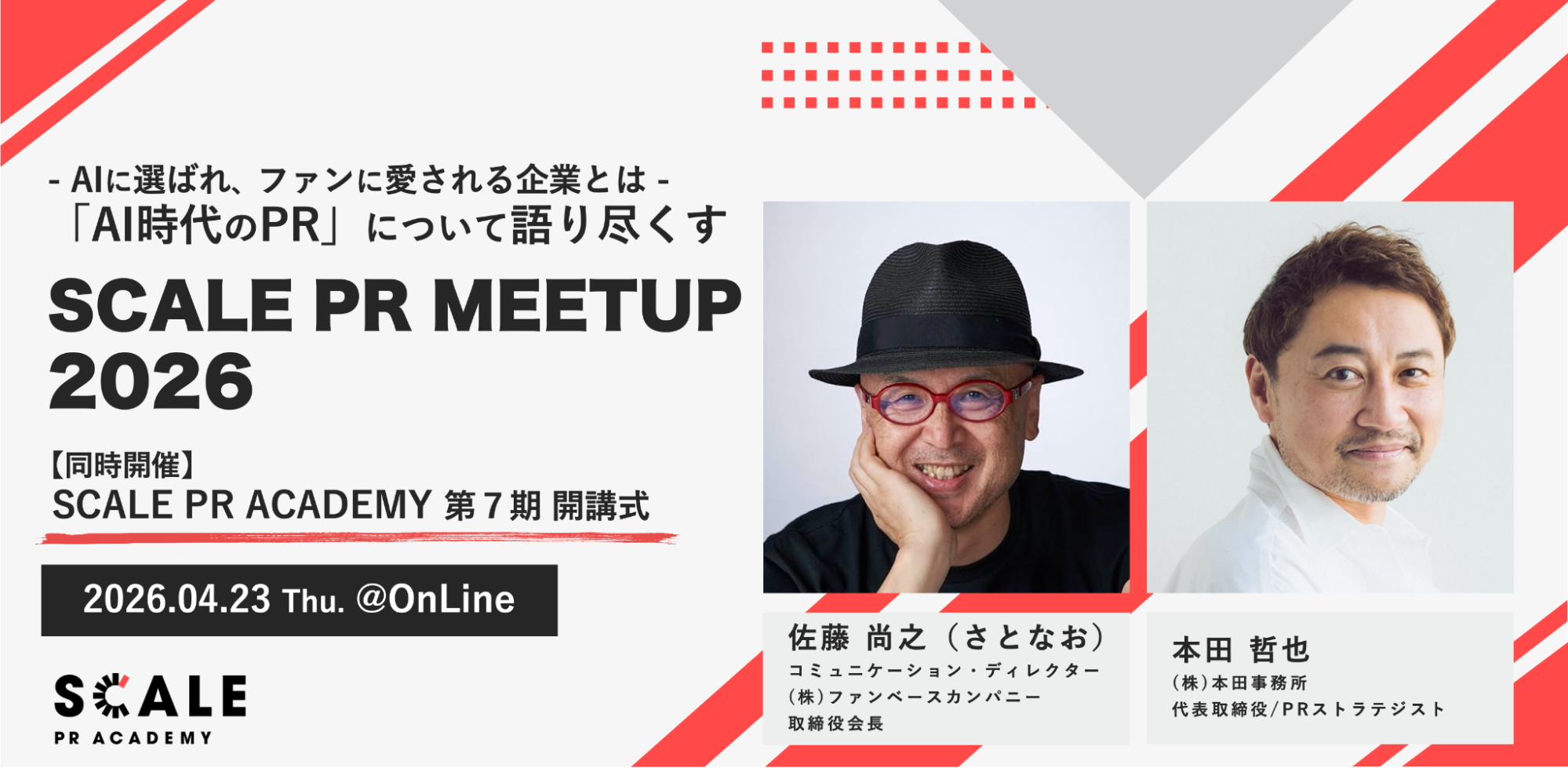 また、開講式当日は、グリーティングイベントとなる「SCALE PR MEETUP」を同時開催。Keynote Sessionに『AIに選ばれ、ファンに愛される。〜変わる生活者とこれからのマーケティング〜』著者の佐藤尚之(さとなお)氏を迎え、「AIに選ばれ、ファンに愛される企業とは。AI時代のPR」をテーマに、SCALE Founder/PR ACADEMY学長である本田哲也と徹底討論いたします。