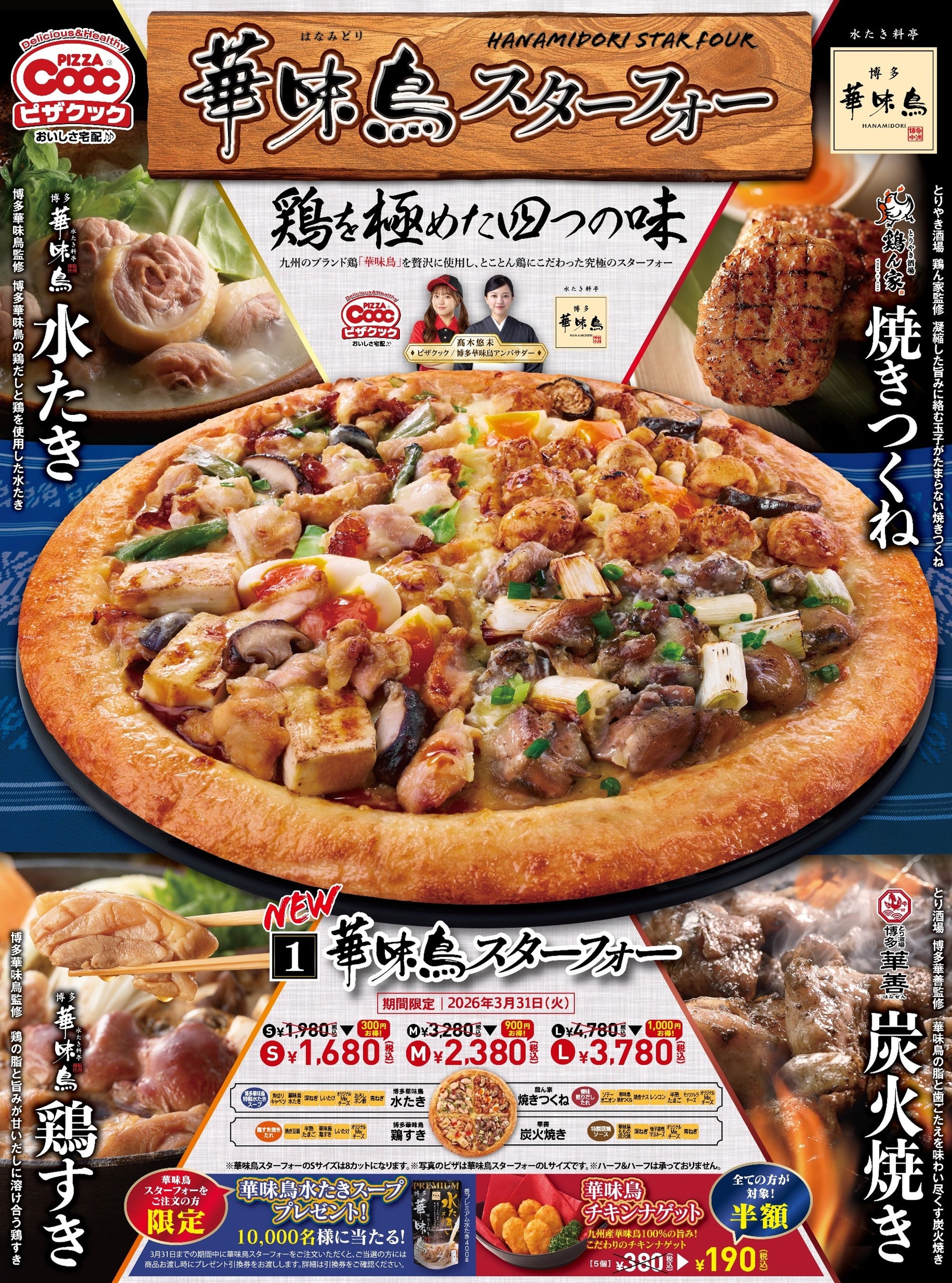 ピザクック(運営元:(株)イワタダイナース 代表:原野拓郎)は、「水たき料亭博多華味鳥」「とりやき酒場 鶏ん家」「とり酒場 博多華善」を運営するトリゼンダイニング(運営元:トリゼンホールディングス株式会社 代表:河津英弘 )とタッグを組み、九州のブランド鶏「華味鳥」を贅沢に使用した『華味鳥スターフォー』を新発売しました。
