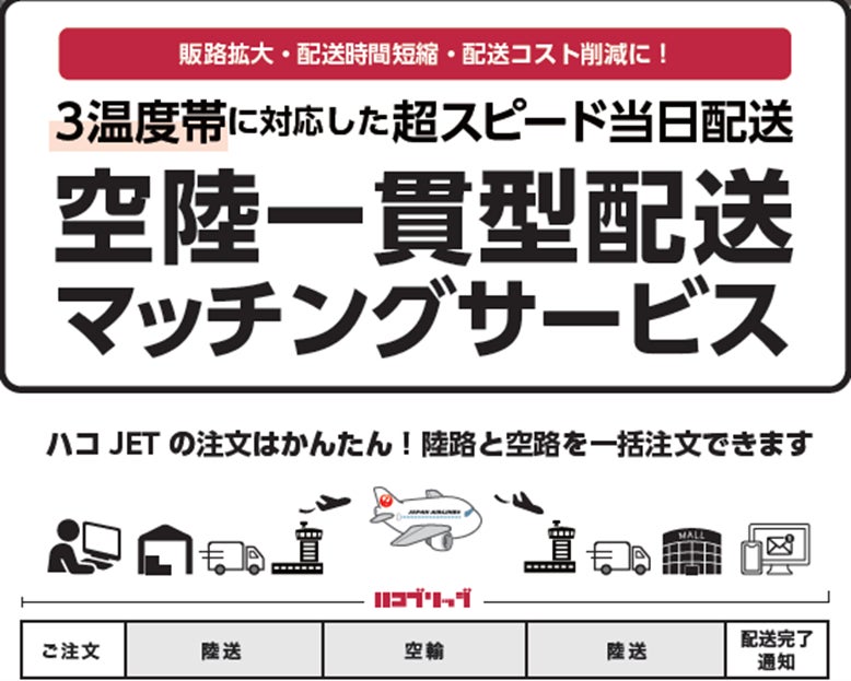 日本航空(JAL)との業務提携により共同開発した空陸一貫、全国当日配送サービス「ハコJET(ハコジェット)」
