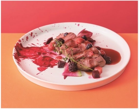 クセがなく旨味あふれるハーブ爽育鴨(そういくがも)のロースト。しっとり柔らかいハーブ鴨とラズベリー、ブラックベリー、ストロベリー、ブルーベリーで作った甘酸っぱいソースが相性抜群です。情熱的でアーティスティックな見た目に仕上がっています。