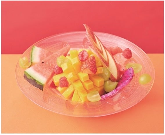 バニラ、いちご味のアイスとホイップクリームの上に、きれいにカットされたマンゴーをはじめ、赤い果実のドラゴンフルーツ、スイカ、いちご、りんごなどのフルーツをたくさん盛り合わせた一皿。華やかな気分が味わえる期間限定のオリジナルデザートです。