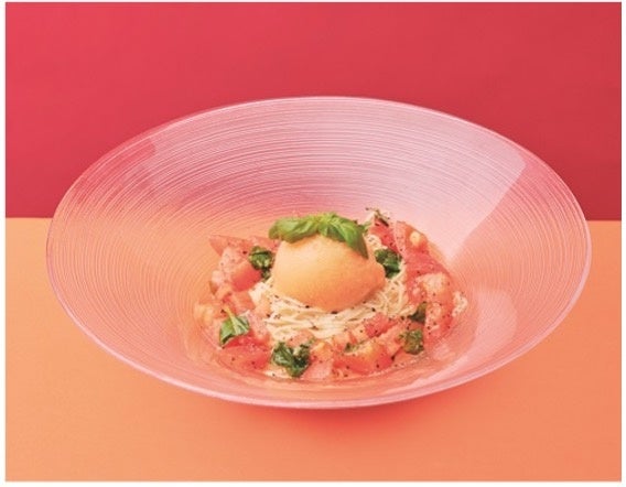 トマトとバジルが相性抜群の特製ソースを絡めたそうめん。小豆島のジェラート専門店「MINORI GELATO」に特注した醤トマトを使用したソルベを添えています。ひんやりとしたソルベの食感を楽しめます。