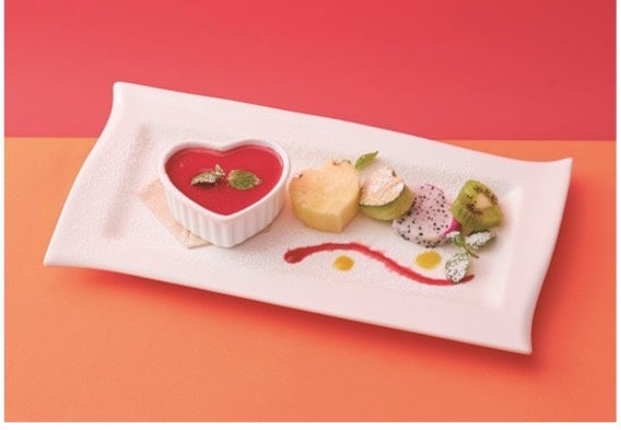 牛乳と生クリームでシンプルに仕上げたパンナコッタのようなデザート「フラン」とフルーツの盛り合わせ。フランもフルーツもハートを形取った愛のこもったキュートなデザートに仕上がっています。