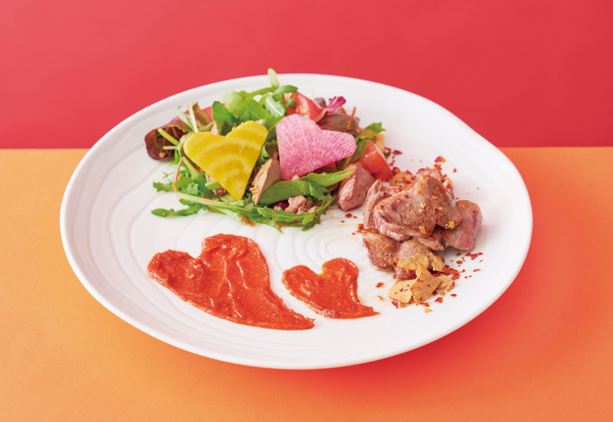 低温調理した濃厚なレバーとトマトのサラダに、ハート(ハツ)のガーリック焼きを合わせました。野菜やお肉、ソースまで、色とりどりの“ハート”がちりばめられたスペシャルなサラダです。
