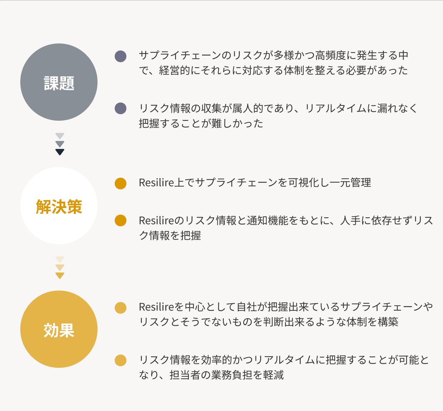 ・Resilireを中心として自社が把握出来ているサプライチェーンやリスクとそうでないものを判断出来るような体制を構築