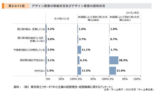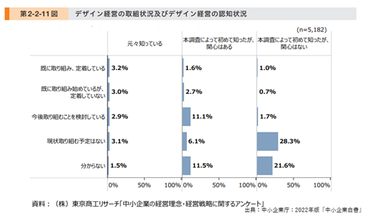 ブランディングデザイン協会は、デジタル社会の進展に対応し、デザイン思考で新たなビジネスモデルを生み出し、企業価値向上に寄与する人材の育成をお手伝いしています。また、近年では経営戦略やビジョンに「デザイン経営」を取り入れる企業も増えてきました。しかしながら、中小企業白書2022によると「(デザイン経営に)既に取り組んでいる企業の割合は12.2%にとどまっている」とあるようにまだまだ限定的です。