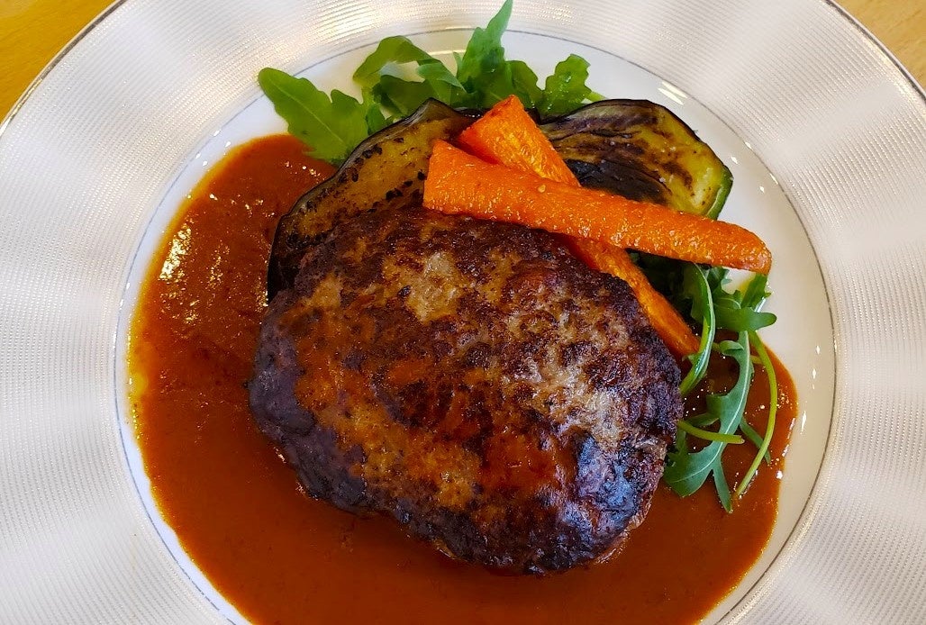 館山から仕入れた猪肉と国産の豚の粗挽きを使用しています。約225グラムのハンバーグは見た目もボリュームも満点です。ソースはマルサラ酒を使ったデミグラスソース。マルサラ酒はイタリア、シチリアでよく作られている甘口のワインです。猪との相性はバツグンの一品。