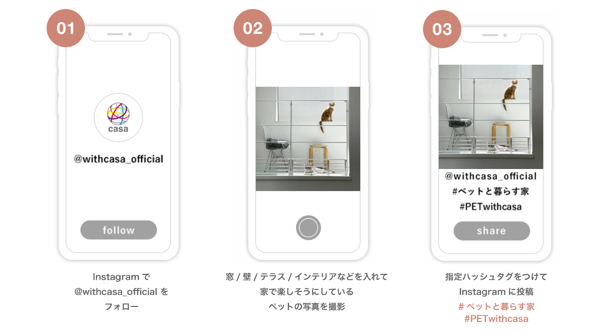 3:本文に #ペットと暮らす家 #PETwithcasa のハッシュタグを記入して投稿してください