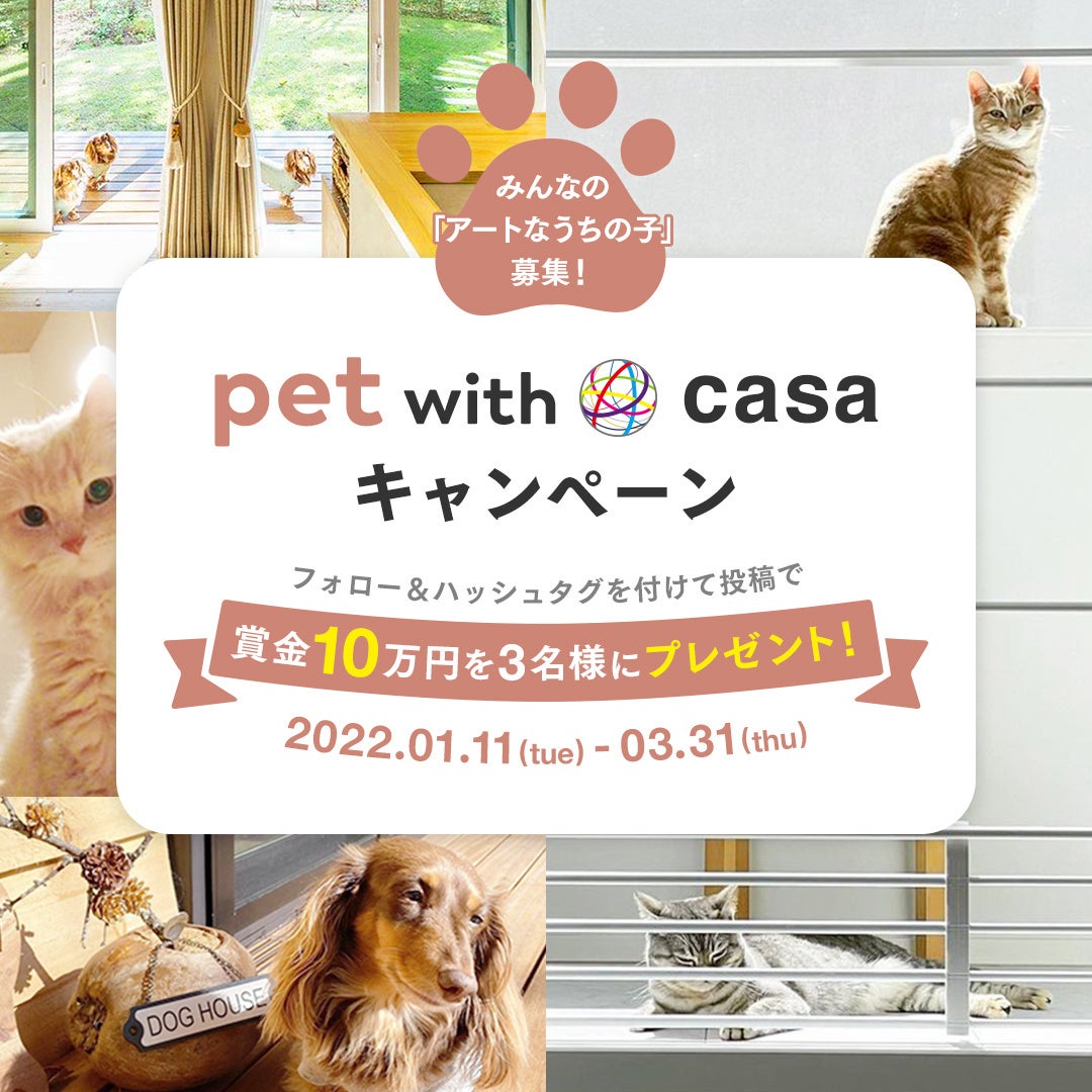 犬や猫をはじめ、ご自宅で動物を飼っているご家庭は多くいらっしゃるもの。コロナ禍による在宅時間の増加により、ペット飼育頭数も増加していると言われています。長い時間を共に過ごす動物は、ペットというよりも大切な家族の一員です。『PET with casa』キャンペーンでは、おうちで楽しく過ごす『アートなうちの子』の写真を広く募集。投稿していただいた方の中から、3名様に賞金10万円をプレゼントします。