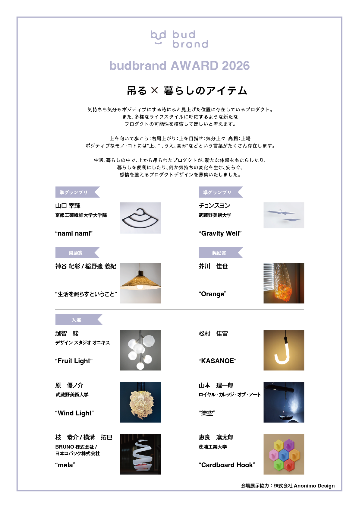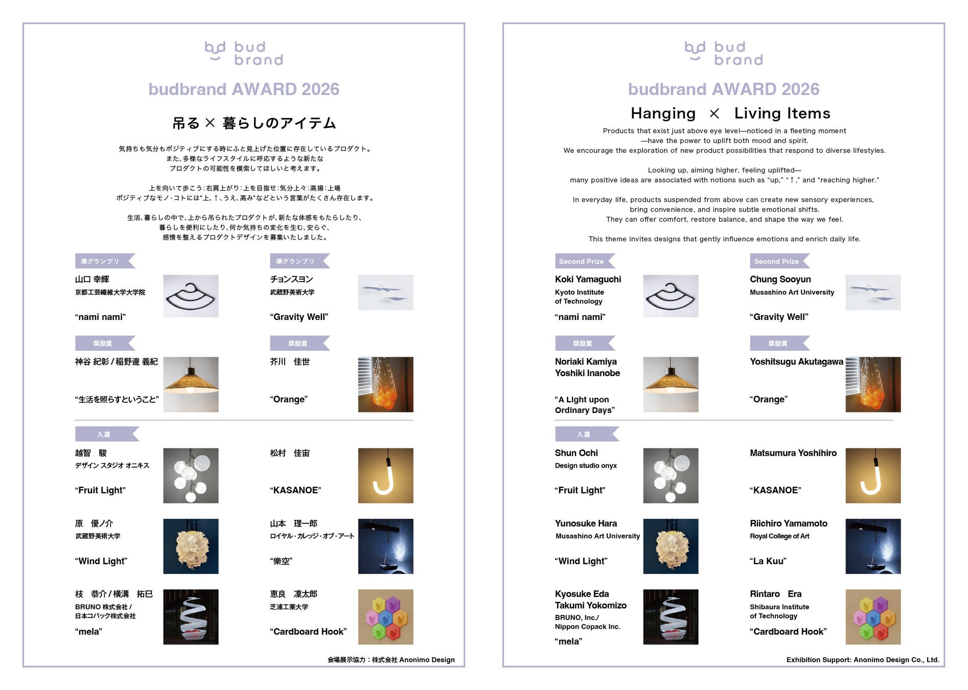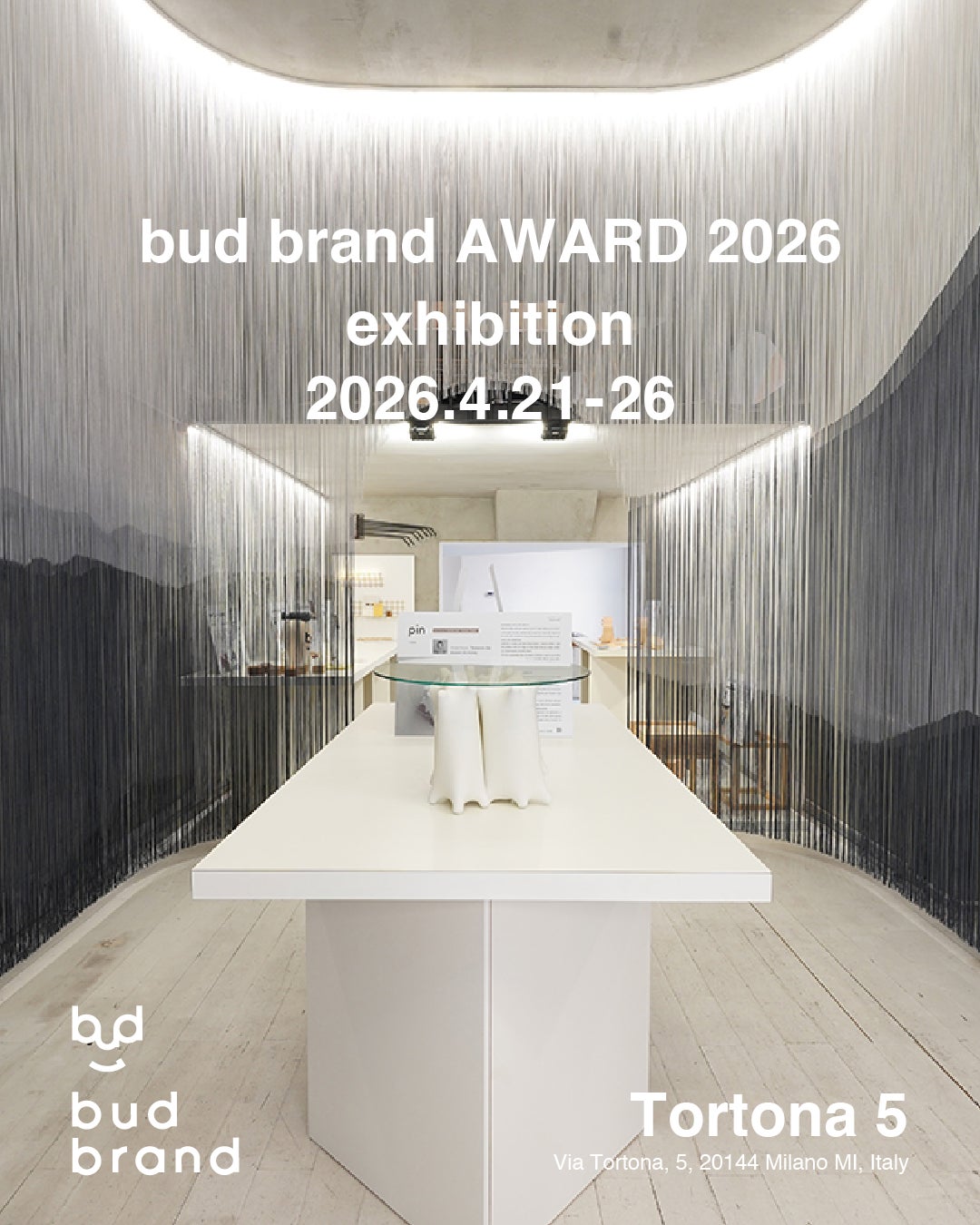 bud brand(バッドブランド)は、次世代クリエイターが世界へ向けて発信するプロジェクトとして、一般社団法人 日本 DESIGN BANKが2016年よりミラノデザインウィーク出展を支援、昨年10周年となった2025年の出展に続き、トルトーナ地区で今年も単独出展をいたします。budbrand AWARD 2026と題し、35歳以下の学生、デザイナーの方を対象にコンテストを開催しました。