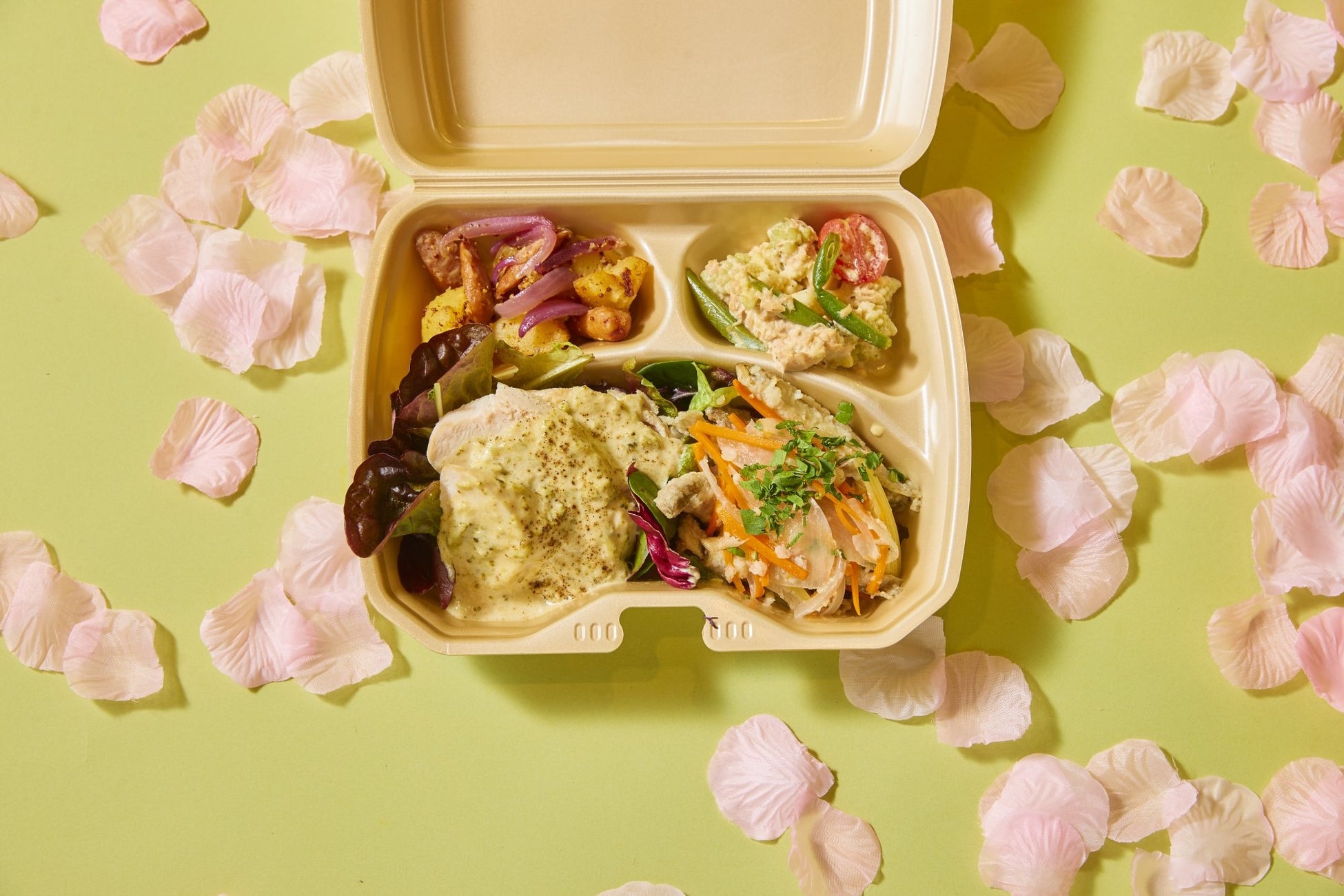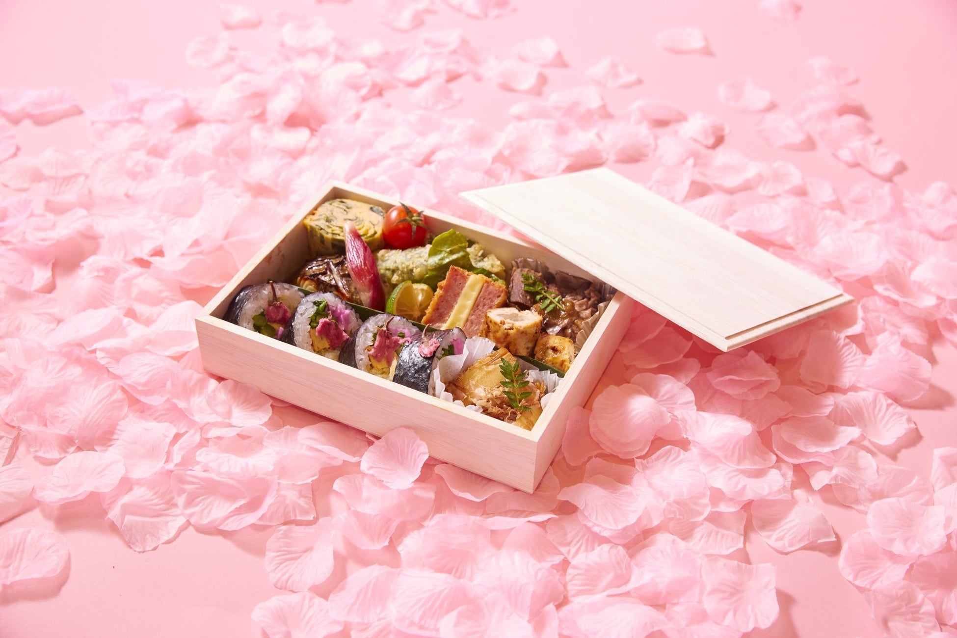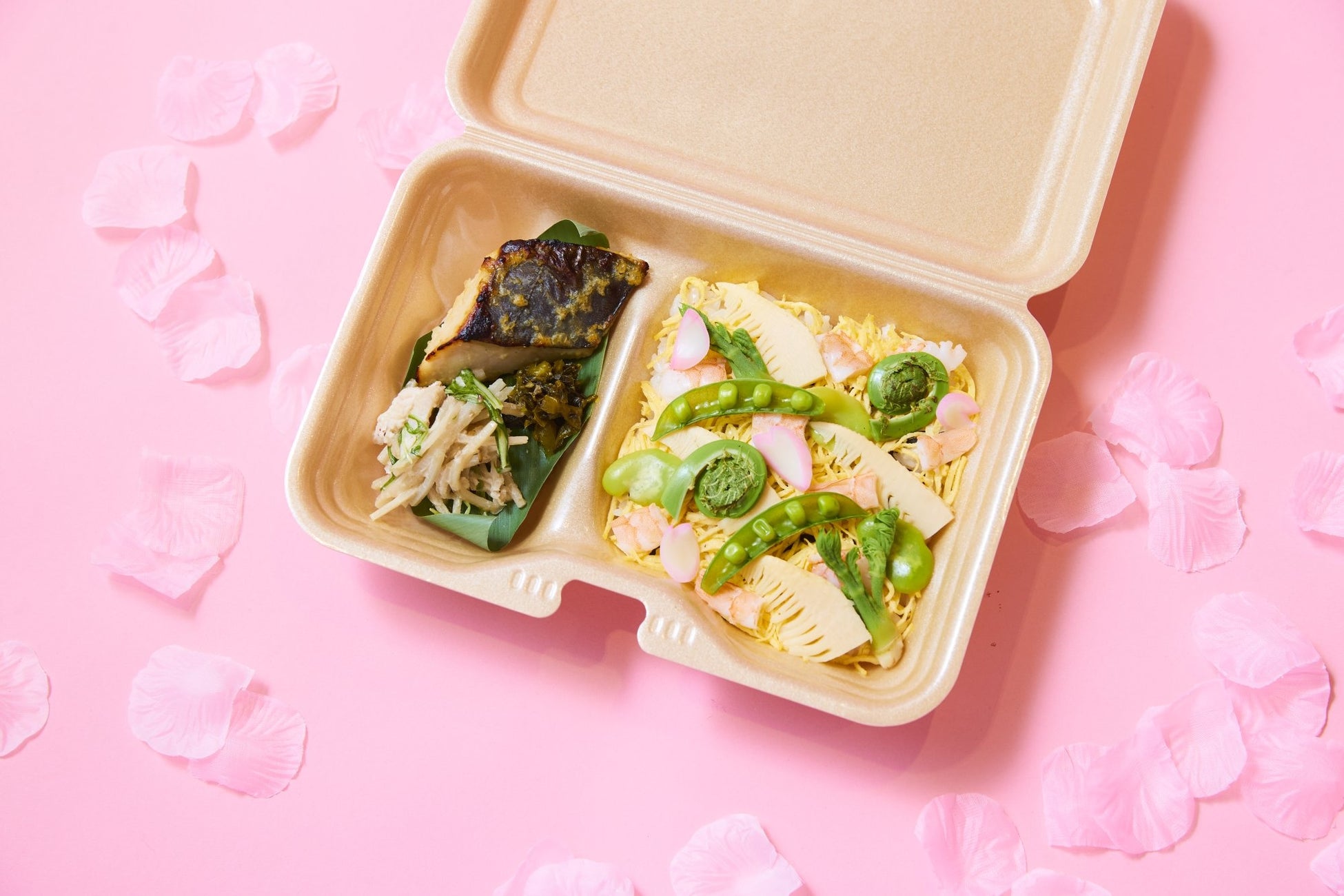 定番のテイクアウトボックスも春色に。メインは日替わり、季節の野菜をふんだんに使用した惣菜は週替わりで3種類。