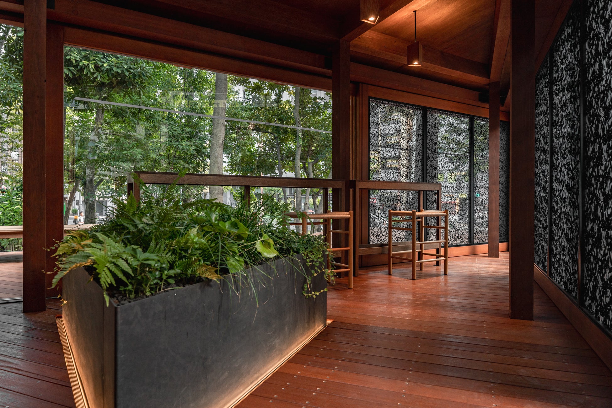 などの工夫が施されています。カフェの周りに広がるデッキでは、自由に寛いで頂くことができ、大きな窓を開 けることで店内と繋がります。木立に包まれながら、それでもまちの気配を感じられるような、ここにしかない空気感を楽しんで頂ければと思います。」