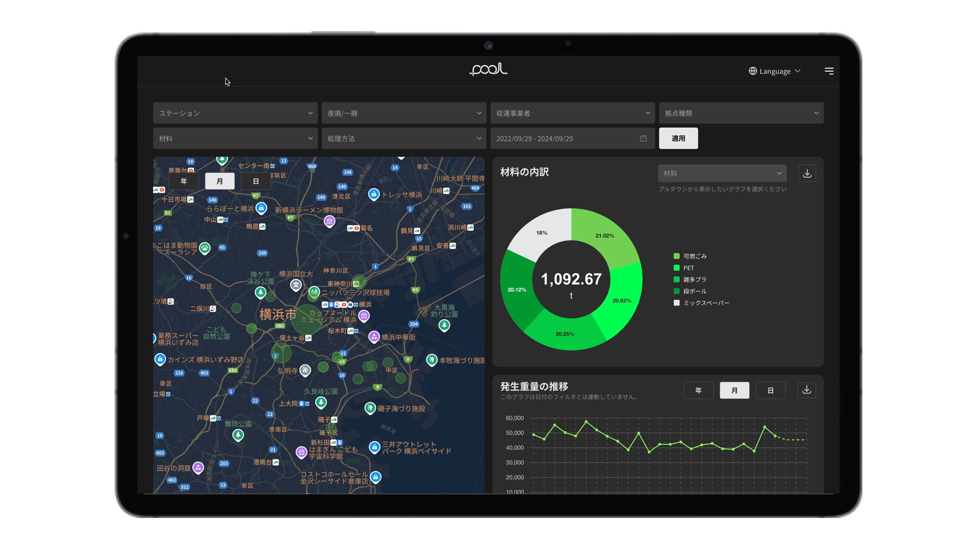 ・可視化したデータの作成協力・アドバイス ・同社が提供するデジタルアプリケーション「pool」を用いた品目別の廃棄物発生状況のリアルタイムの可視化 |
