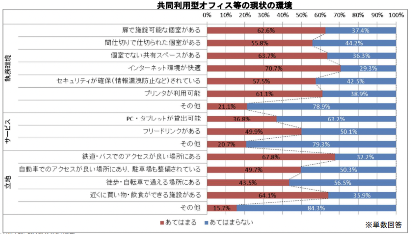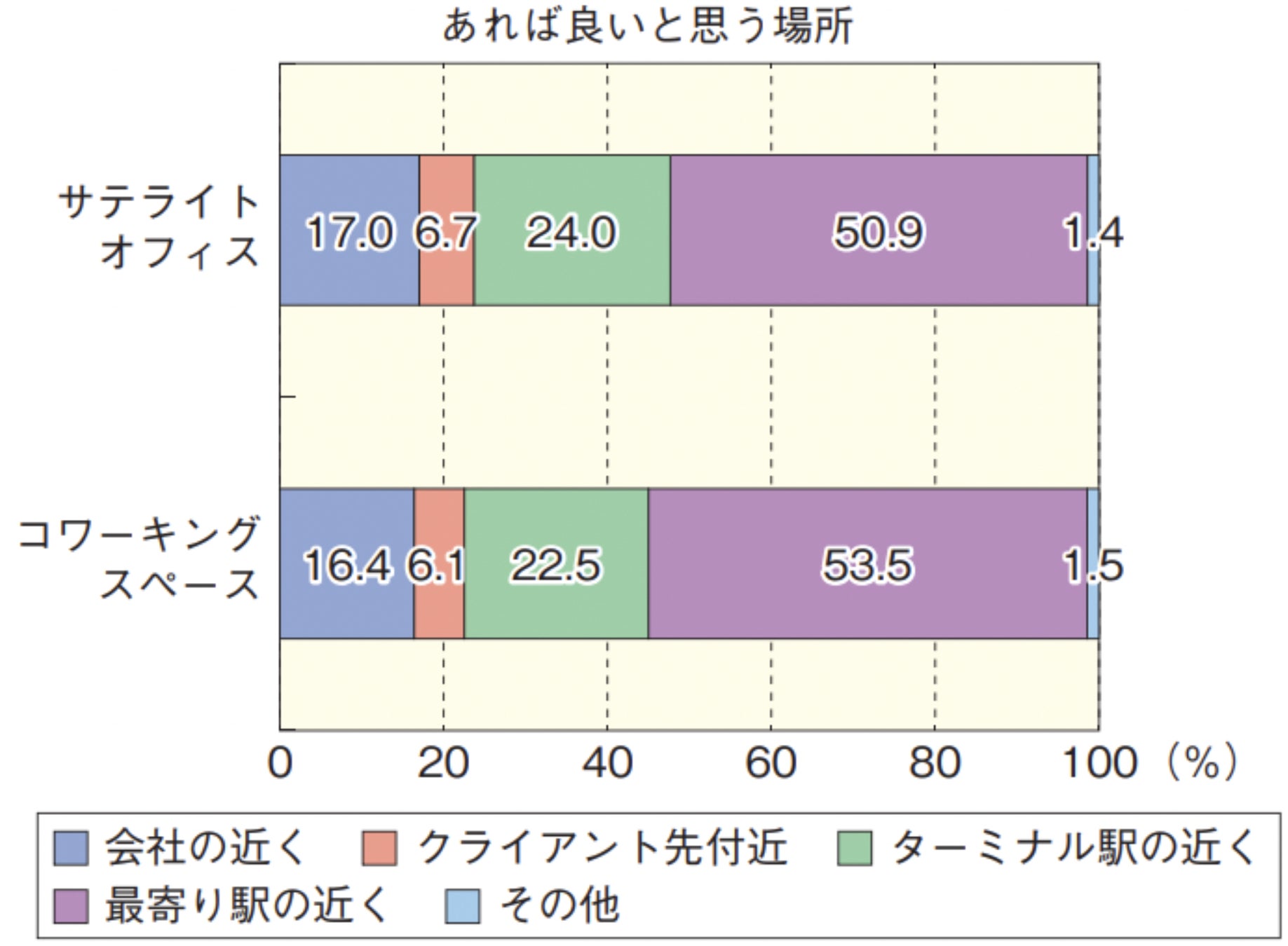 令和2年度の国土交通省の調査によると、テレワークの実施場所は、自宅が90%と最も多い結果となりましたが、実施して悪かった点として、「テレワークをするための機器が十分備わっておらず、不便だった」(17.5%)「仕事をする部屋等の環境が十分でなく不便だった」(35.2%)との回答が多く、コワーキングスペース等の利用意向のある人は、テレワーク実施者のうちの38%となっております。