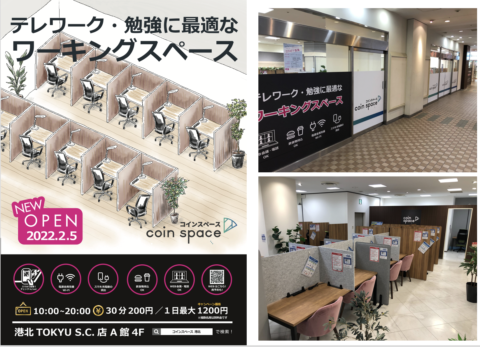 コインスペース株式会社(本社:東京都渋谷区、代表取締役:栗原知也)は、 テレワークや自習に最適なワーキングスペース「コインスペース」を、 2022年2月5日(土)、横浜市営地下鉄センター南駅 前の商業施設「港北 TOKYU S.C.」にオープンいたします。オープニングキャンペーンとして、2月21日(月)まで1日最大料金500円でご提供いたします。