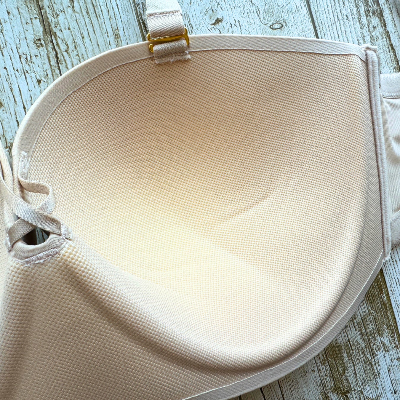 着け心地がとても良く、シンプルで白いTシャツにも透けなかったです☆ストラップを外すと、安定感がなく落ちてきてしまうのかなぁと思っていましたがこのブラは四段ホックでしっかりホールドしてくれて、落ちてくる心配はありませんでした☆