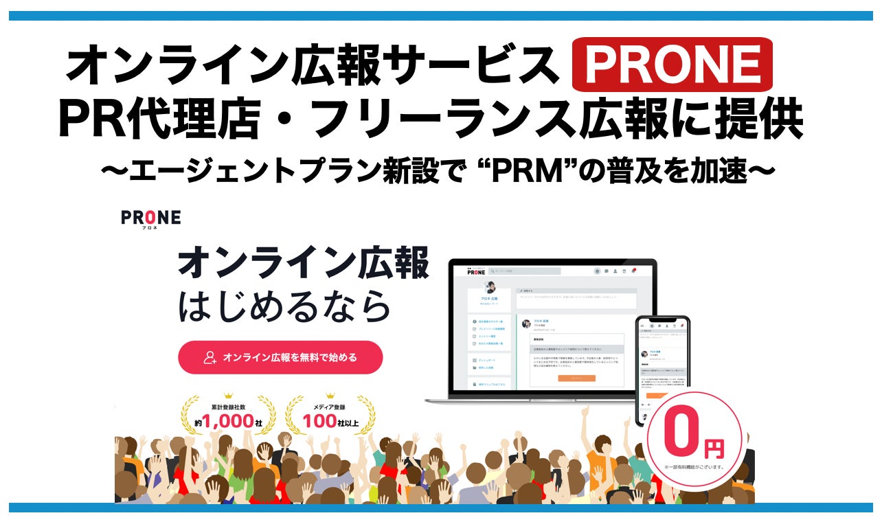 PRM(Public Relations Management:パブリックリレーションズマネジメント※1)の提供を通じて、広報を経営機能として活用したい企業の事業成長を支援する株式会社シプード(本社:東京都中央区、代表取締役:舩木芳雄・舩木真由美)は、オンライン広報サービスPRONE(プロネ:https://prone.jp/ )に新たにエージェントプランを新設し、4月1日より企業の広報・PR活動を支援するPR代理店やフリーランス広報向けに提供開始します。