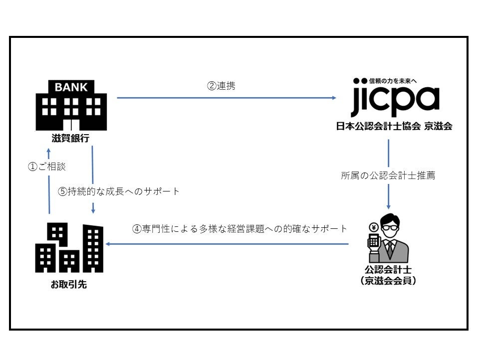 当行と日本公認会計士協会京滋会は、相互の連携と協力により、地域社会の発展および中小企業の経営課題解決を目指し、以下の事項において連携します。