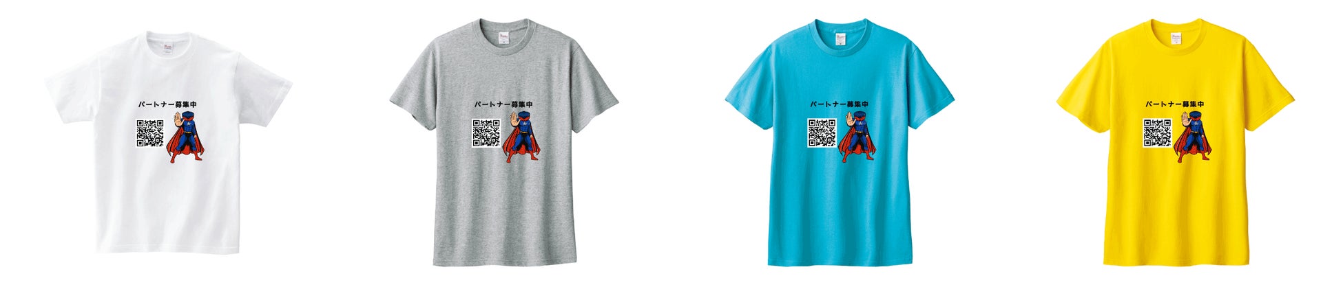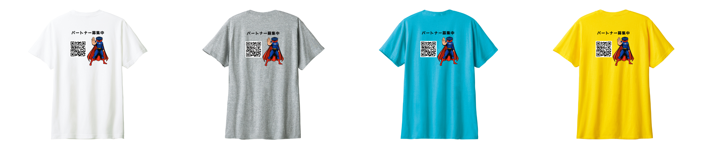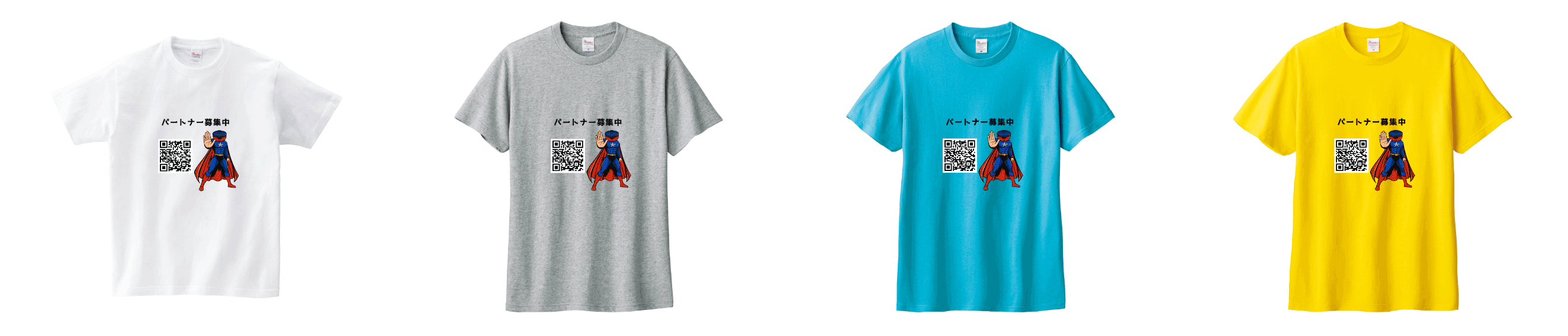 カスタネット パートナー募集Tシャツのお値段は送料込み 4,290円。前面プリント版と背面プリント版に各4色(ホワイト・グレー・ターコイズ・デイジーイエロー)が用意されています。