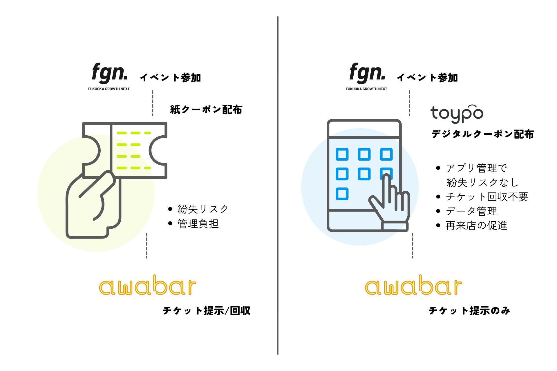 第一段階として、FGN 1階のスタンディングバー「awabar Fukuoka」で利用されているドリンクチケットを、従来の紙媒体からトイポのデジタルクーポンへ移行。イベント参加者はtoypoアプリを通じてクーポンを受け取り、懇親会にスムーズに参加できる仕組みを導入しました。
