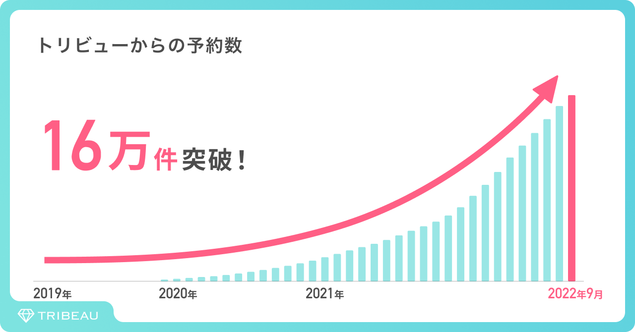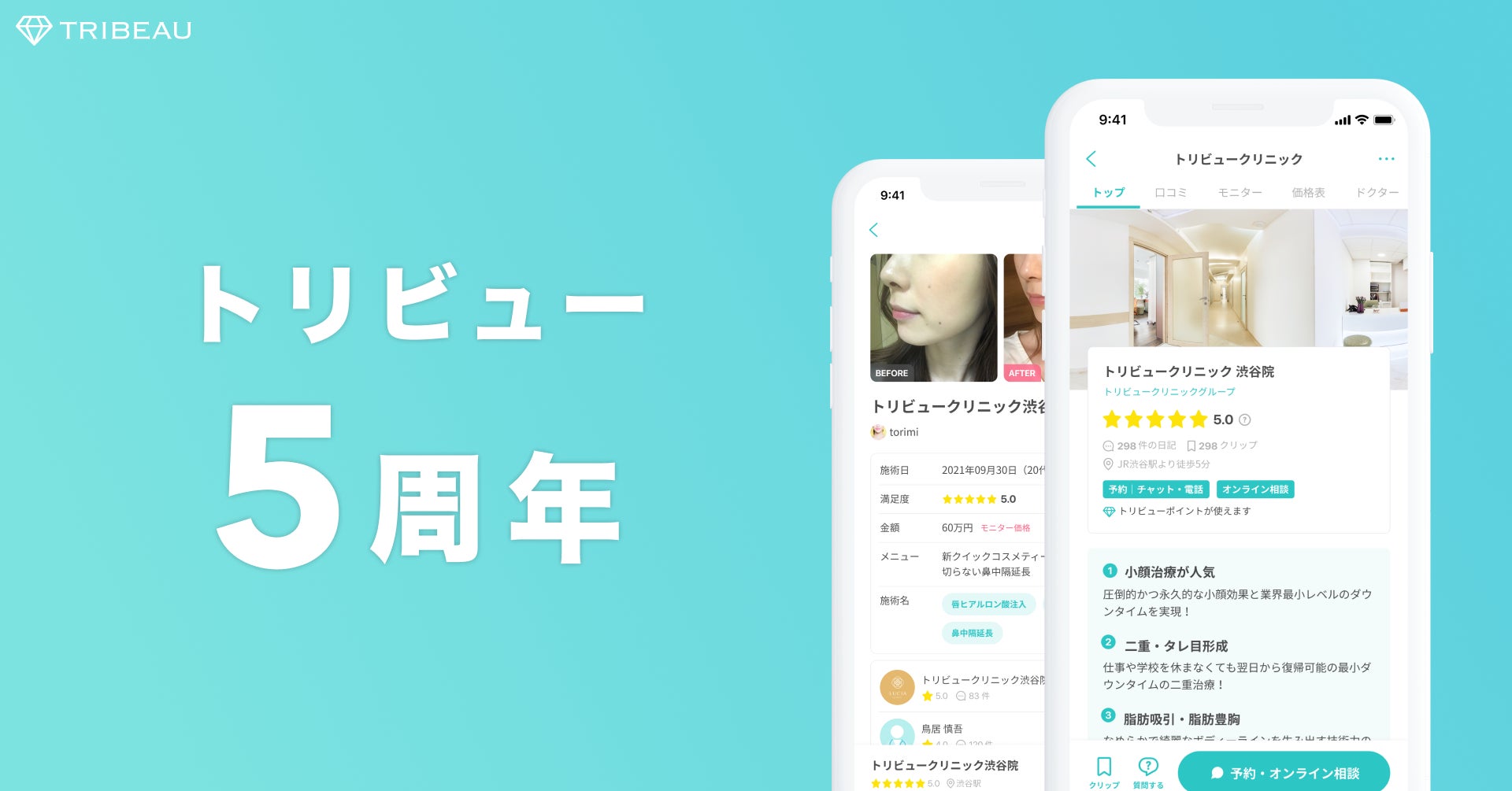 株式会社トリビュー(本社:東京都渋⾕区、代表取締役:⽑迪)は、運営する美容医療の口コミ・予約アプリ「トリビュー」が2022年10月で5周年を迎えたことをお知らせいたします。この1年で更なる成長を遂げ、予約数は累計16万件(前年比3.4倍)、流通総額は累計65億円(前年比2.4倍)を突破いたしました。当社の取り組みや1年間の変化を、インフォグラフィックとともに公開します。