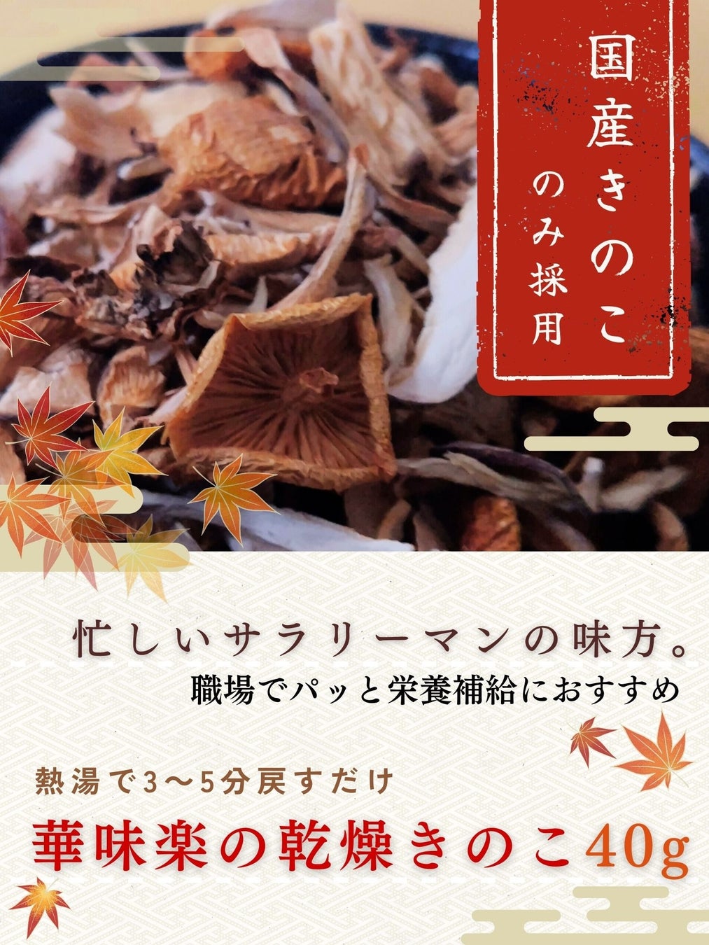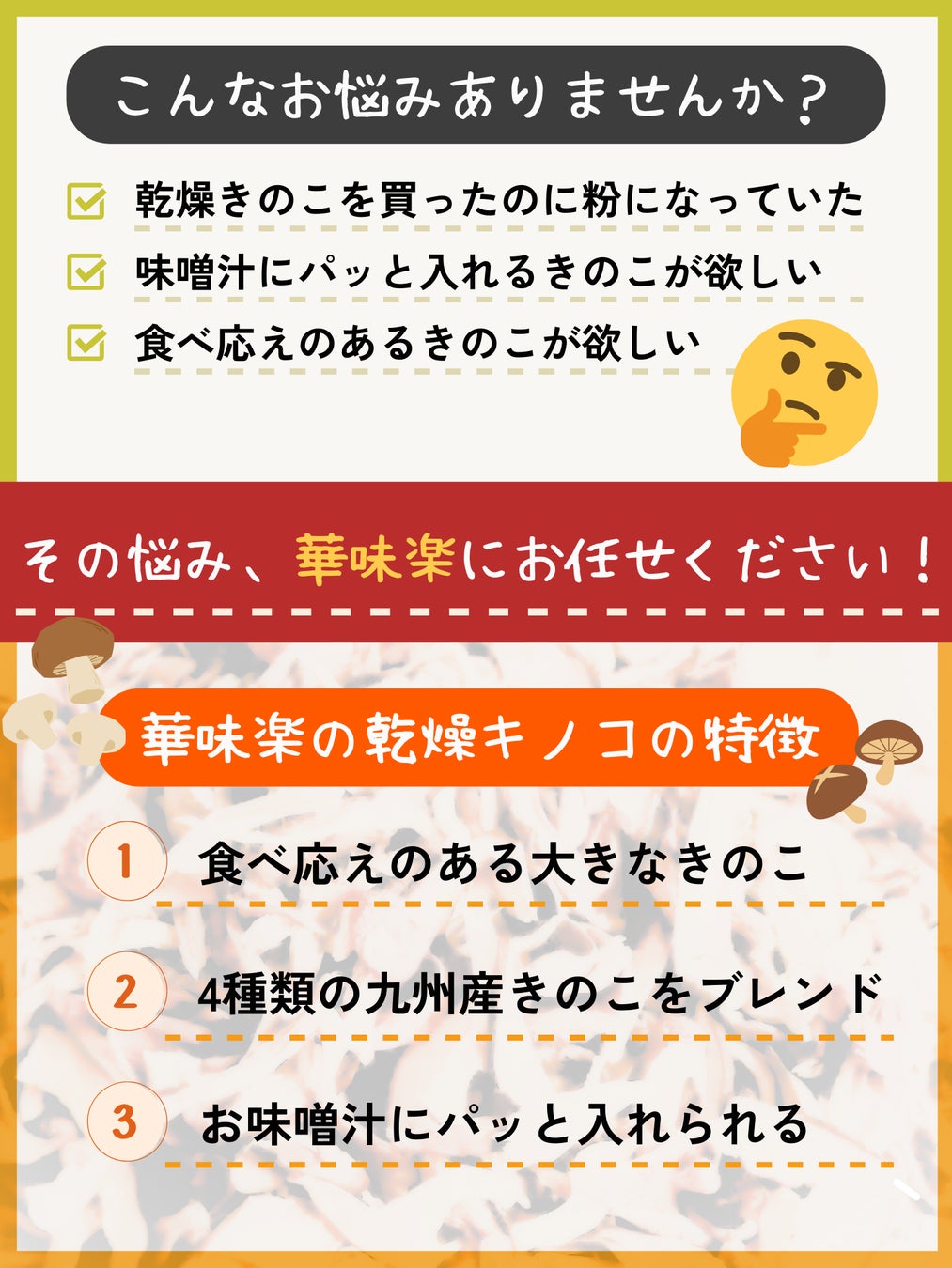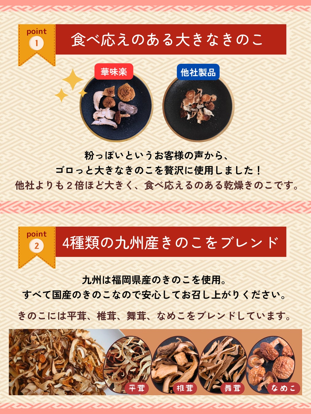 他社では粉になって食べにくいため、華味楽の乾燥きのこはゴロっと大きい食べ応えのあるきのこを厳選しました。4種類のきのこ、平茸、椎茸、なめこ、舞茸をブレンドしました。