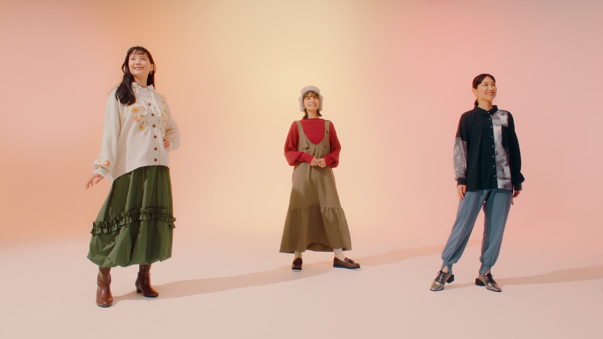 登場する女性たちにはosharewalkerの秋冬のコーディネートを着こなしてもらいました。細部までこだわったデザインやシルエット、トータルコーディネートにもぜひご注目ください。