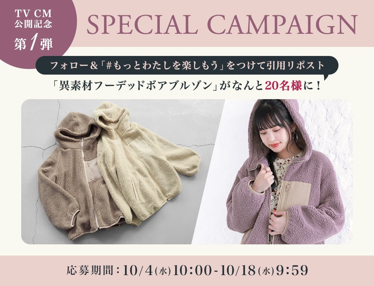 オシャレウォーカー公式Xアカウント「@osharewalker_0」をフォローし、今回のCMタイトルである【#もっとわたしを楽しもう】のハッシュタグをつけて引用リポスト(引用リツイート)していただくと、抽選で20名様に「異素材フーデッドボアブルゾン」をプレゼントします。
