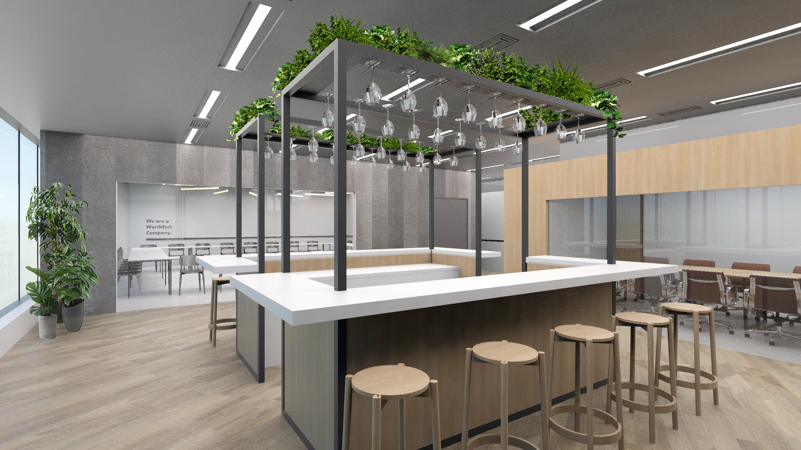 一方、環境への配慮から壁紙の一部にはコーヒー豆殻を使用し、大きな窓を活かした自然光と木目を基調とした温かく過ごしやすいデザイン、そして随所に散りばめられた緑によって、屋内にいながらも自然環境を感じるようなリラックスできるオフィス空間としています。また、共用スペースのバーカウンターでは、日中はリフレッシュエリアとして利用ができる他、夜間はアルコールの提供も可能となっており、業務終了後のリフレッシュやカジュアルな談笑ができるコミュニケーションスペースとなっています。