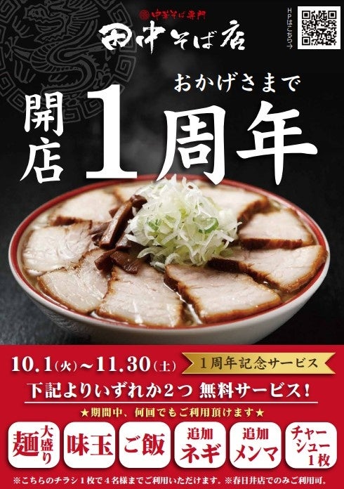 人気飲食店、つけ麺「つじ田」や江戸前天丼「金子半之助」などをグループで運営する、オイシーズ株式会社(所在地:東京都 千代田区 、代表取締役社長:工藤 智)傘下、株式会社 GMSが運営する「中華そば専門 田中そば店 春日井店」が 2024年10月6日 (日) に開業1周年を迎えます。皆様のご愛好に感謝し2024年10月1日(月)より1周年特別イベントを開催いたします。