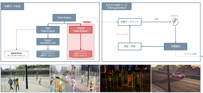 □CGを用いることで擬似的な都市や人物、物体を仮想空間に構築し、学習データを生成。 学習データ収集業務が不要となり、映像収集から学習データ生成までを従来の約10倍の効率化を見込んでいる