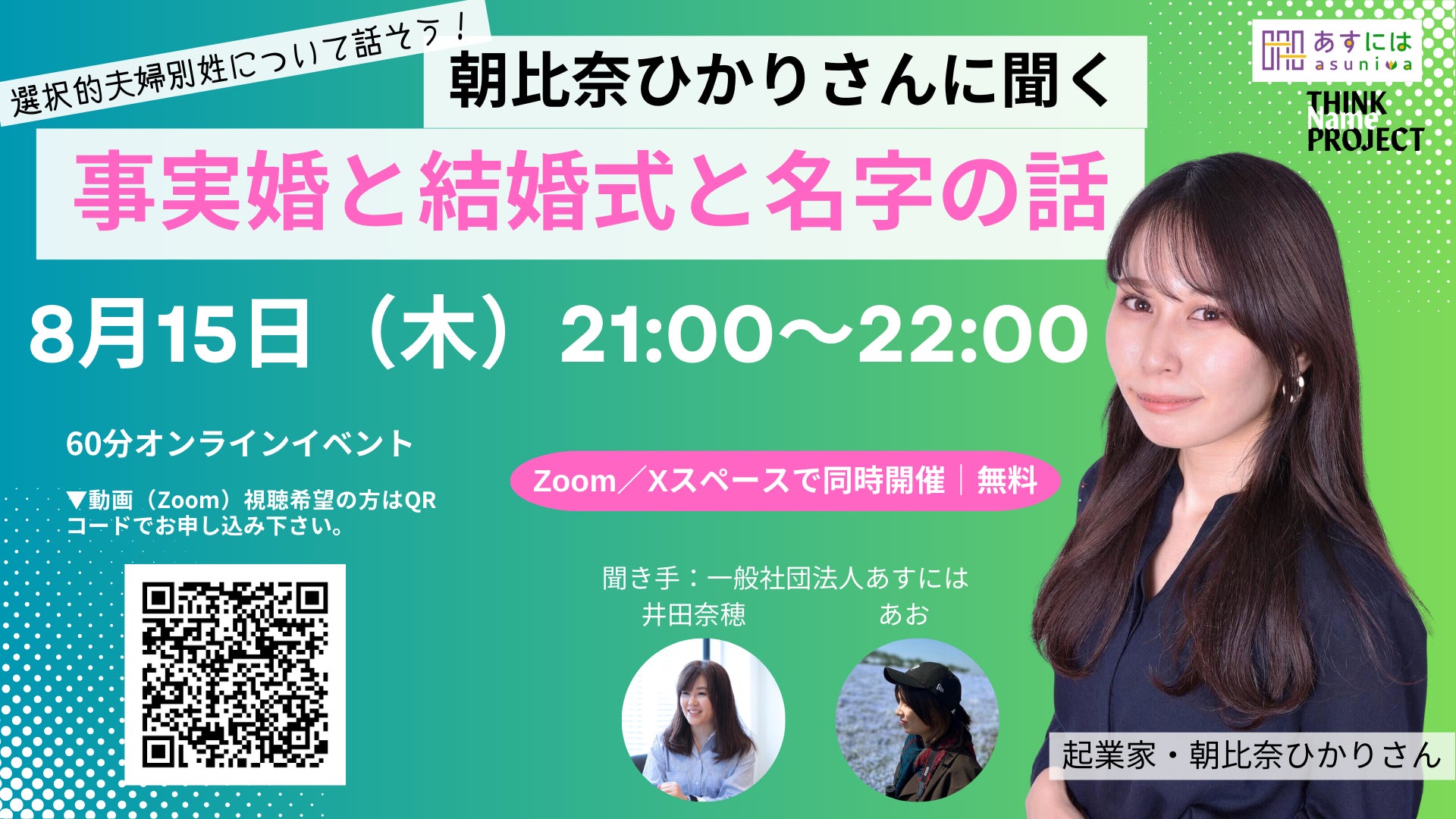 朝比奈ひかりは、2023年に夫婦別姓を目的として事実婚を選択し、2024年に挙式を行いました。自身の経験を通じて、ABEMAヒルズに出演したところ大きな反響がありました。あすにはのイベントでは、等身大の視点で夫婦別姓や事実婚、結婚式について語ります。Z世代の選択的夫婦別姓に関する実体験を基に、その社会的意義や課題について深く掘り下げた内容をお届けする予定です。