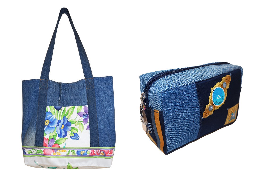 (左)デニムトートバッグ ¥49,500(税込)(右)デニムポーチ ¥16,500(税込)