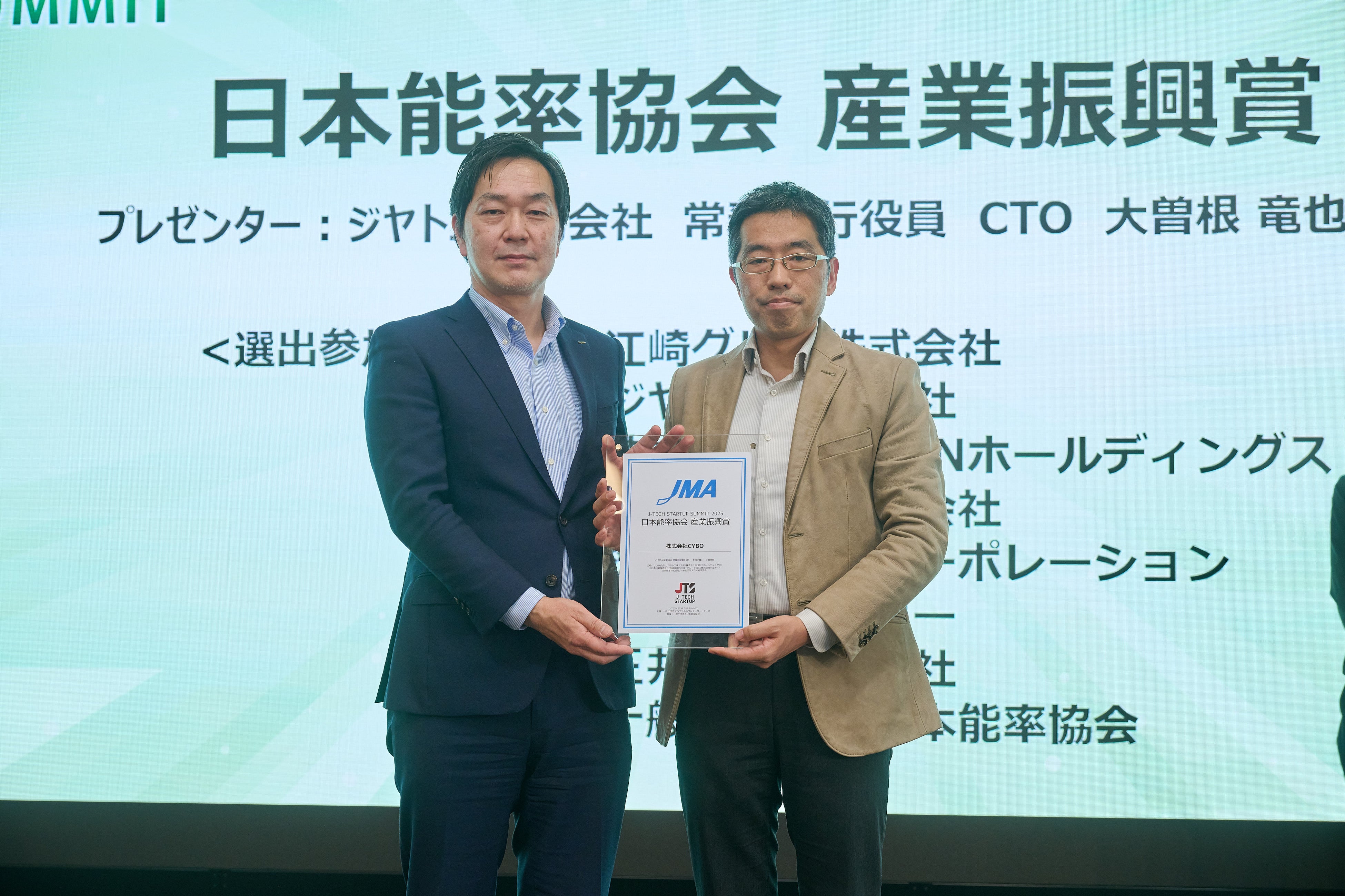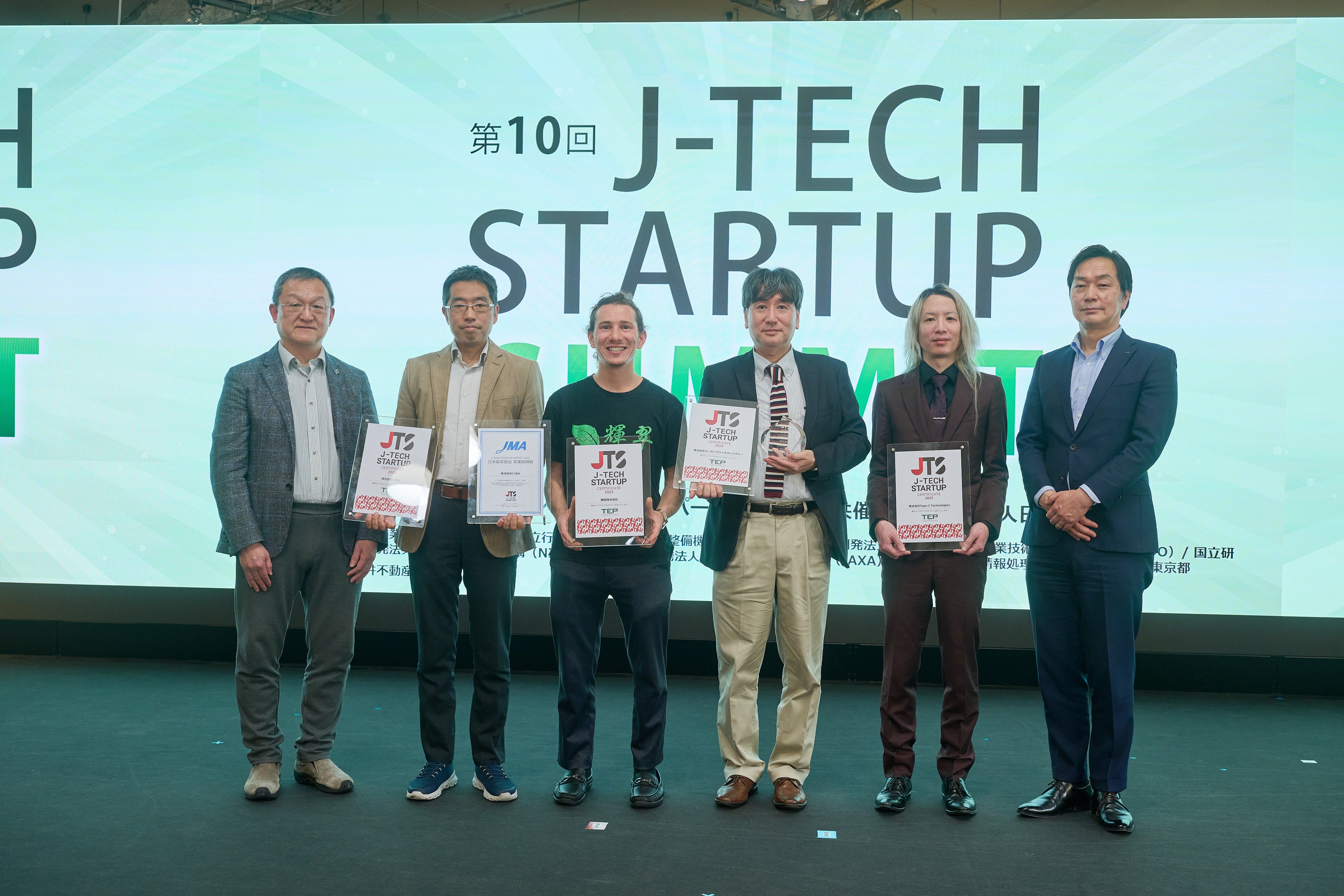 2026年2月24日(火)に、Tokyo Innovation Base(有楽町)において開催された「第10回 J-TECH STARTUP SUMMIT」では、「J-TECH STARTUP 2025」に認定された4社の事業プレゼンや認定証授与のほか、「大学・国研発スタートアップの持続発展的成長を目指して」をテーマに議論が展開されたパネルディスカッション、株式会社カーボンクライオキャプチャーへの『大学・研究機関発スタートアップ賞』の授与が行われ、共催の一般社団法人日本能率協会による当日選考の結果、株式会社CYBOが『日本能率協会 産業振興賞』を受賞し、授与式が行われました。