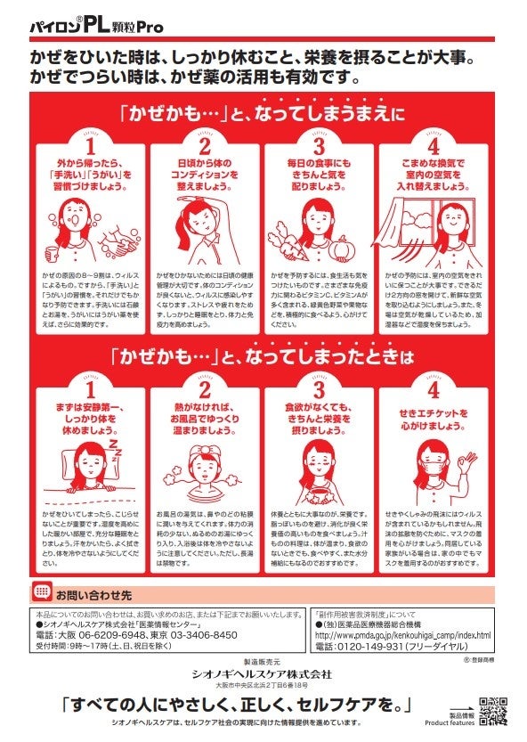 添付文書裏面にはイラストやアイコンを用いて、かぜのひき始めが疑われる時の注意点や、かぜをひいてしまった時のアドバイスをわかりやすく記載し、医薬品 情報に限らず生活者に役立つ情報を提供することでセルフケアを推進しています。