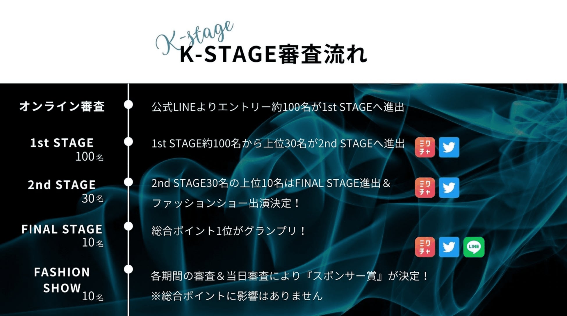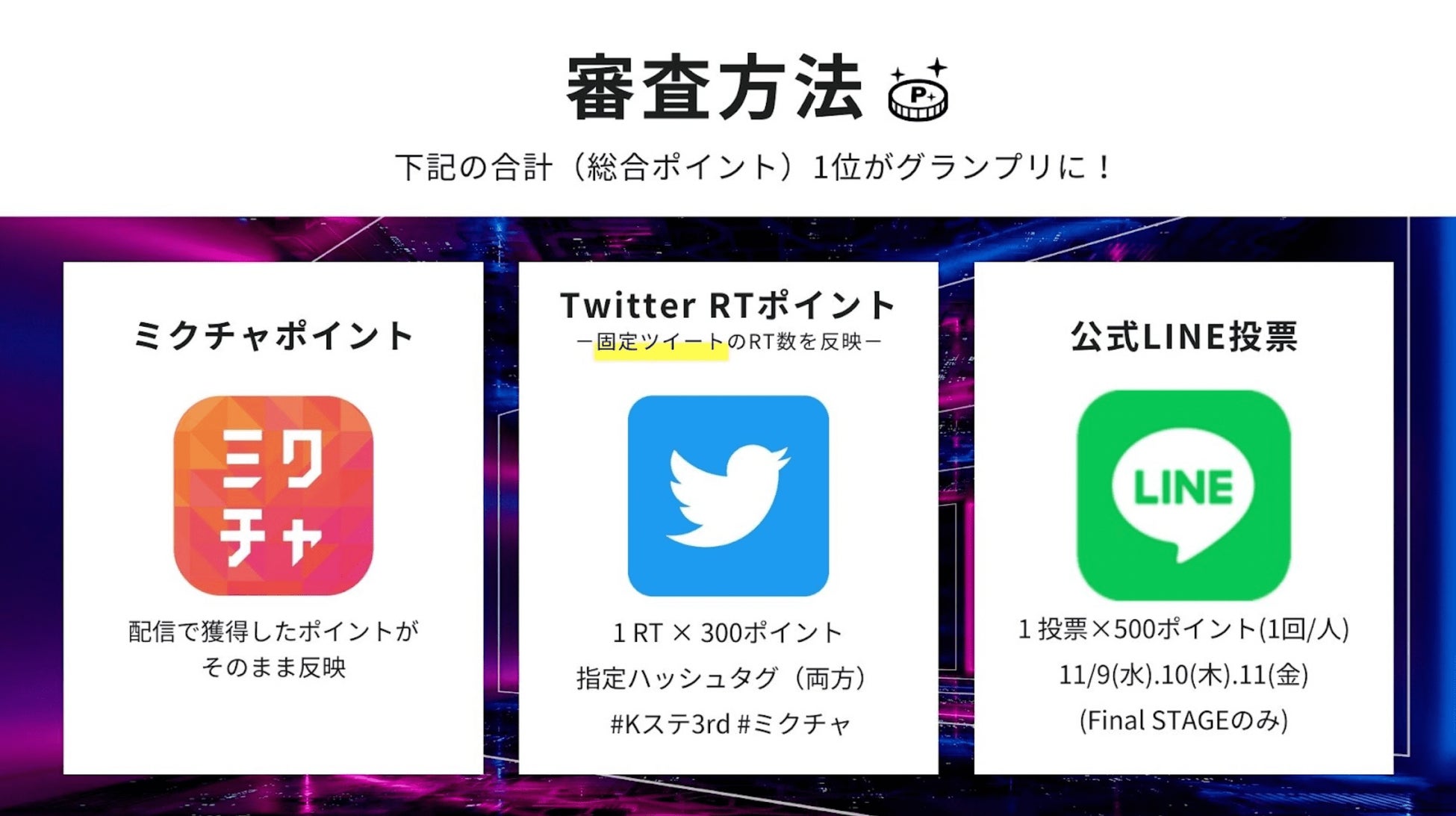 1st STAGE、2nd STAGEではコミュニティアプリ「ミクチャ」でのライブ配信で獲得したポイントや、Twitterの固定ツイートのリツイート数に応じてポイントが加算。FINAL STAGEでは上記に加えて、公式LINEでの投票ポイントが加算され、GRAND FINAL進出者が決定されます。