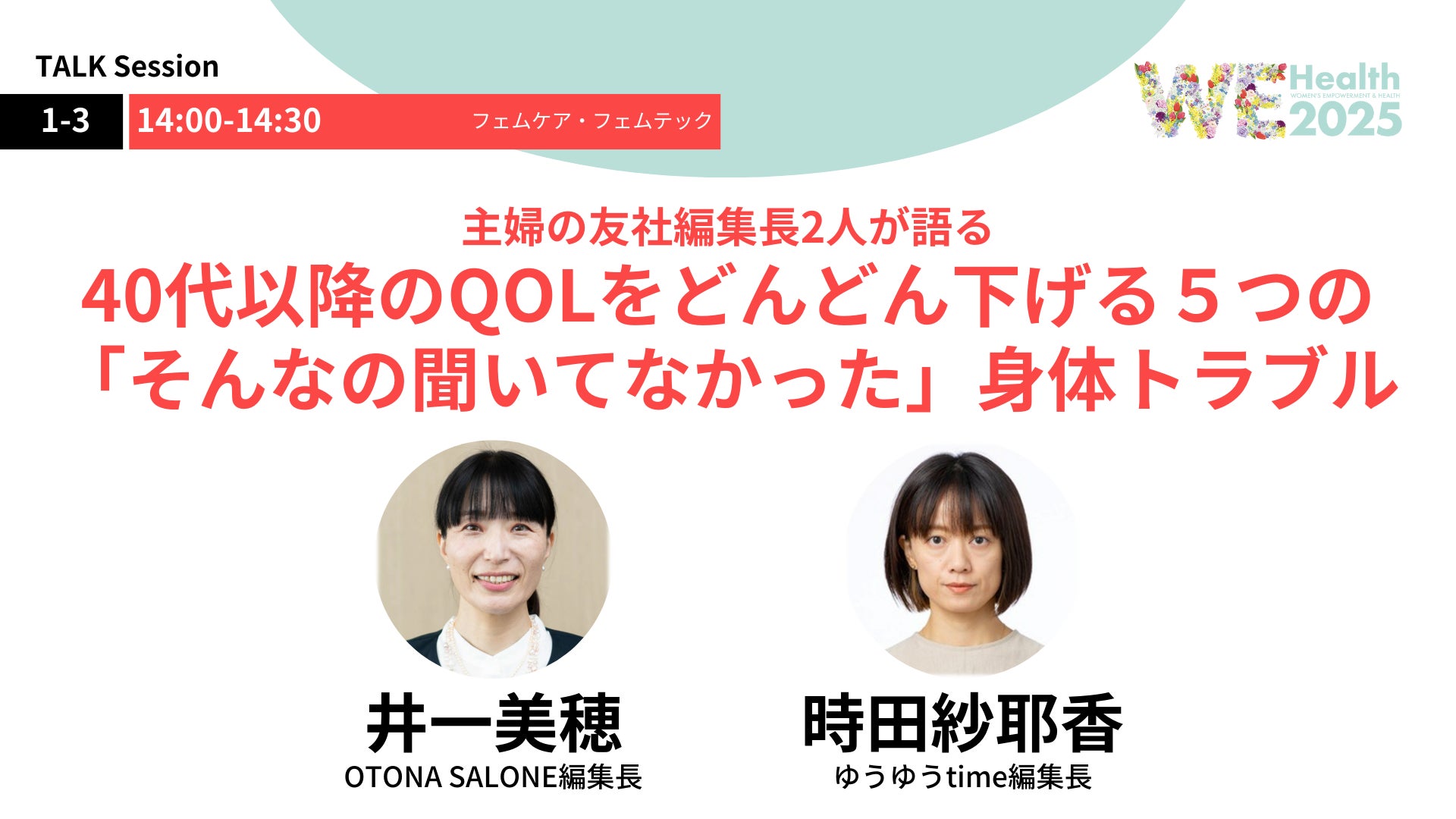 40代を迎えると、突然現れる身体の不調に驚かされることはありませんか?このトークセッションでは、主婦の友社で健康・ライフスタイルに精通した編集長2人が、「そんなの聞いてなかった!」と思わず叫びたくなる、40代以降に起こりがちな身体トラブルを徹底解説します。放置するとQOL(生活の質)が低下しかねない問題をどう乗り越え、対策すればいいのか、最新情報や実体験を交えてお伝えします。これからの自分をもっと快適に、もっと元気にするためのヒントを一緒に見つけましょう!