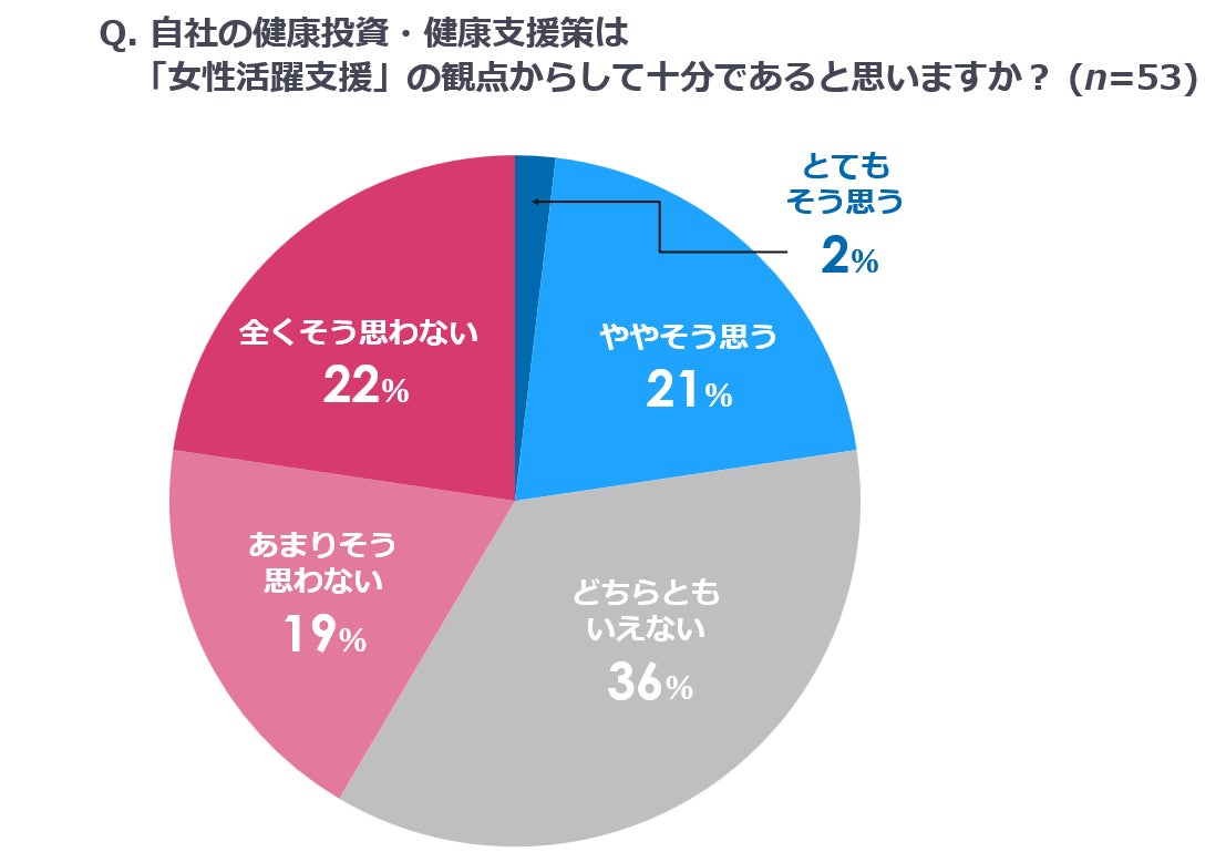 ① 女性活躍支援と関連した自社の健康支援策について、回答者の41%が現状自社で行われている健康支援策は「女性活躍支援」の観点からは「不十分」と回答しました。