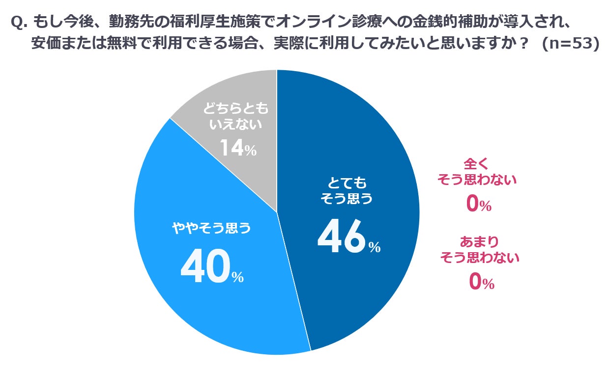 ④ 福利厚生として、企業がオンライン診療を補助し安価に利用できる場合、回答者の86%が実際に「利用してみたい」と回答し、利用についてのネガティブな回答は0%でした。この結果から、企業の福利厚生としてオンライン診療が補助される場合、一定以上の利用率が見込め、社員に十分に活用される福利厚生施策となりえることが考えられました。