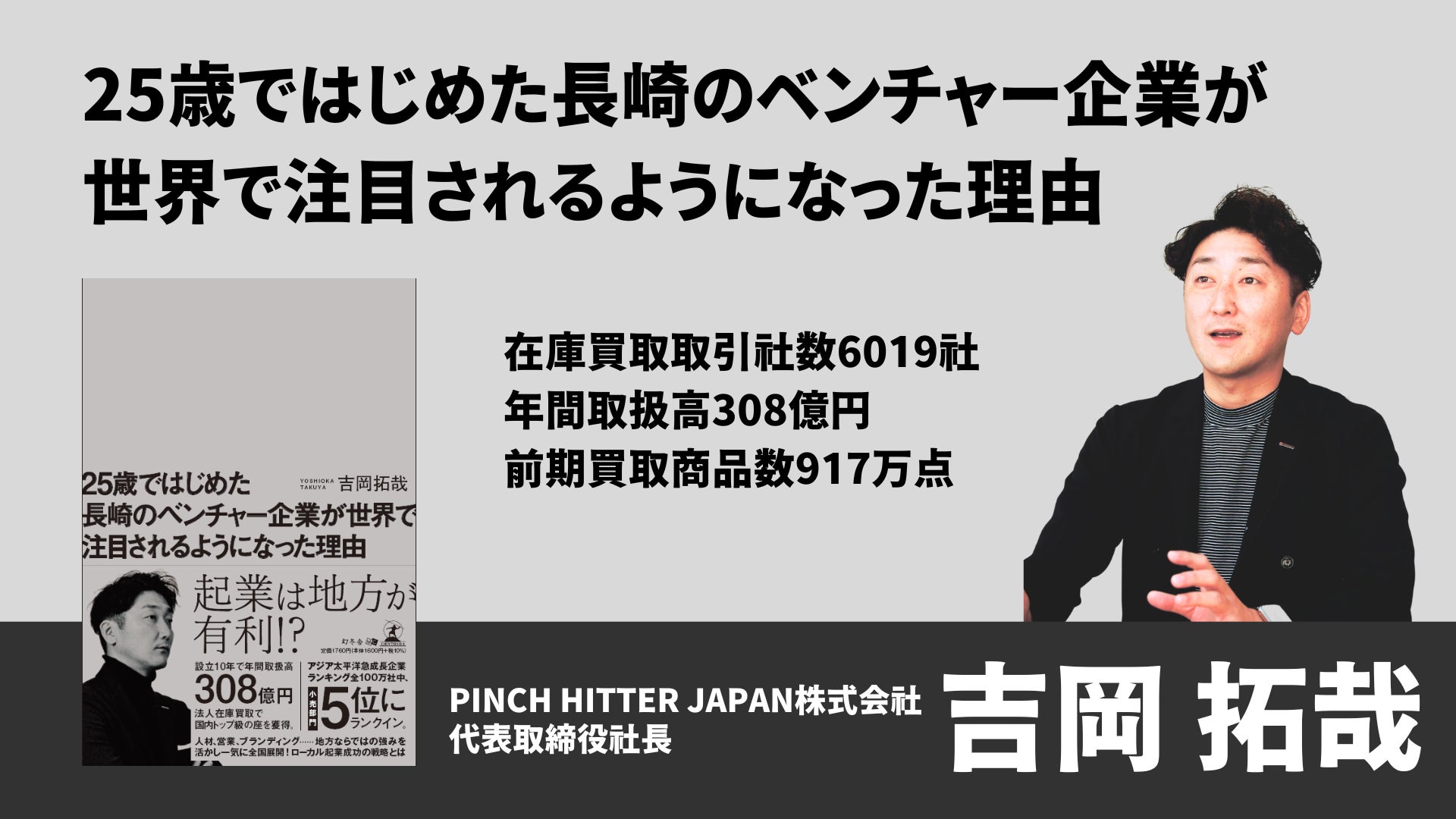 企業が抱える滞留在庫を一括買取、再流通、M&Aの仲介ではなく事業そのものを買取、販売しているPINCH HITTER JAPAN株式会社(本社:⻑崎県諫早市、代表取締役社⻑:吉岡 拓哉)は、2023年3月28日に