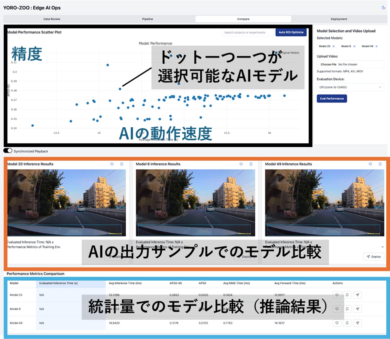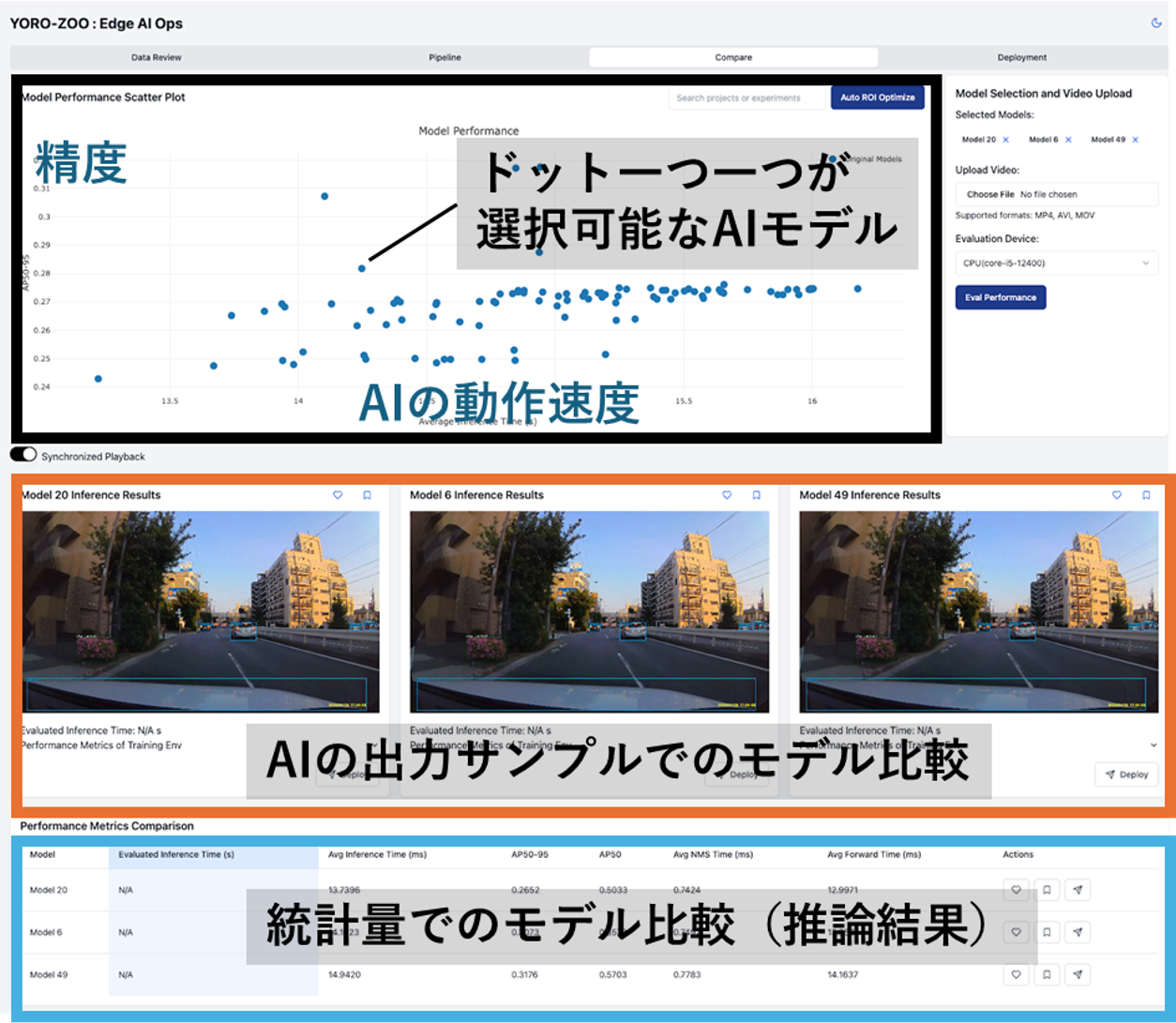学習後のAIモデルから複数サイズのモデルの結果・推論速度を比較し、目的にあったモデルを選択していただけます。