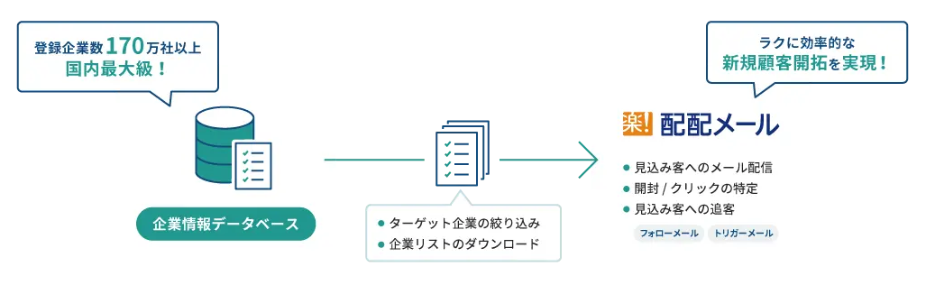 本オプションでは、企業検索サービス「BIZMAPS」から確度の高い企業情報の検索・ダウンロードが可能です。そして、ダウンロードしたリストへ「配配メール」を活用してアプローチすることで、効率的に新規顧客の開拓ができます。
