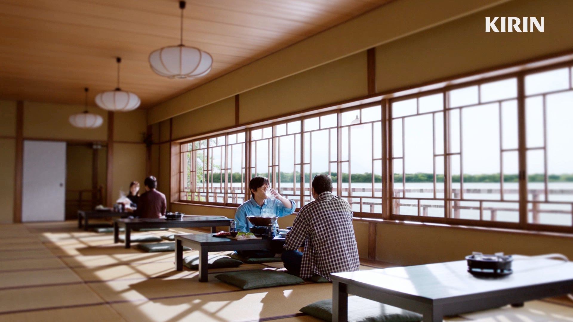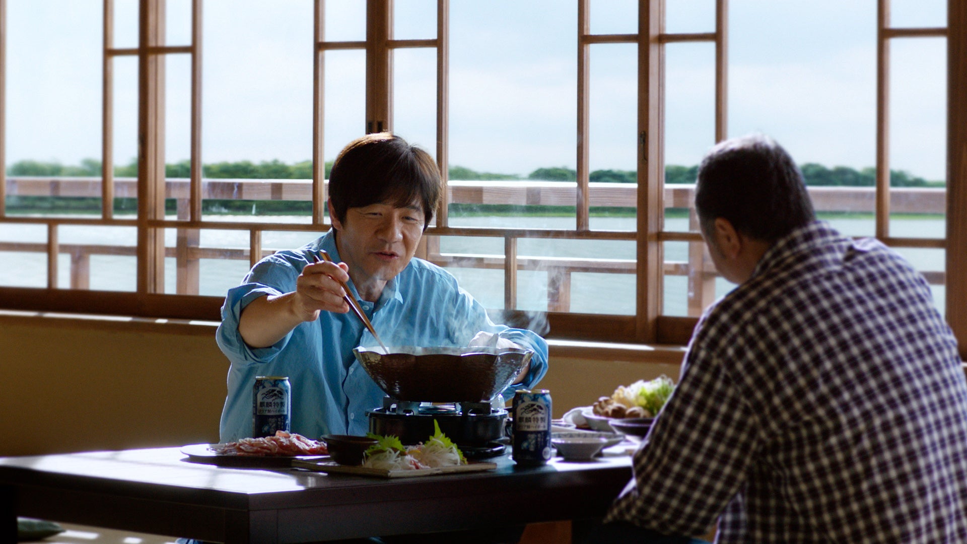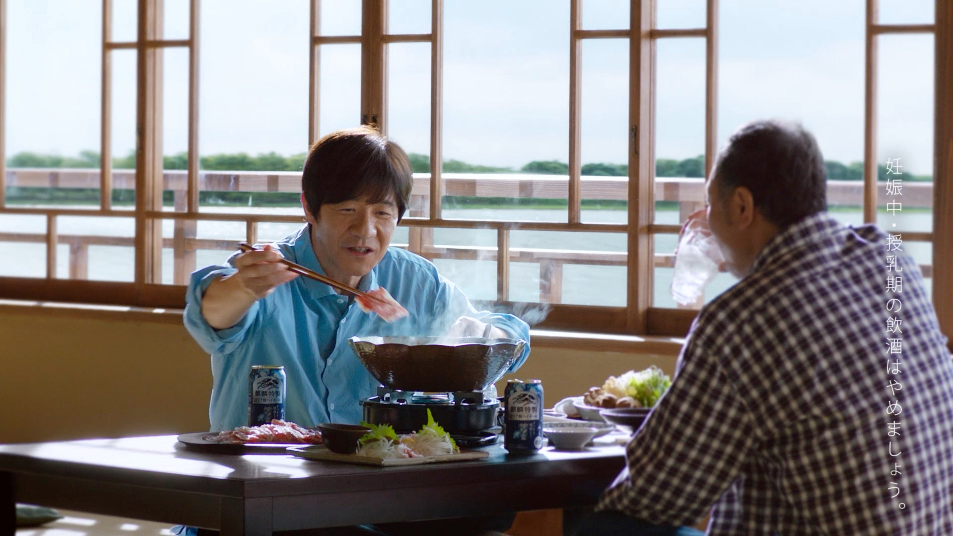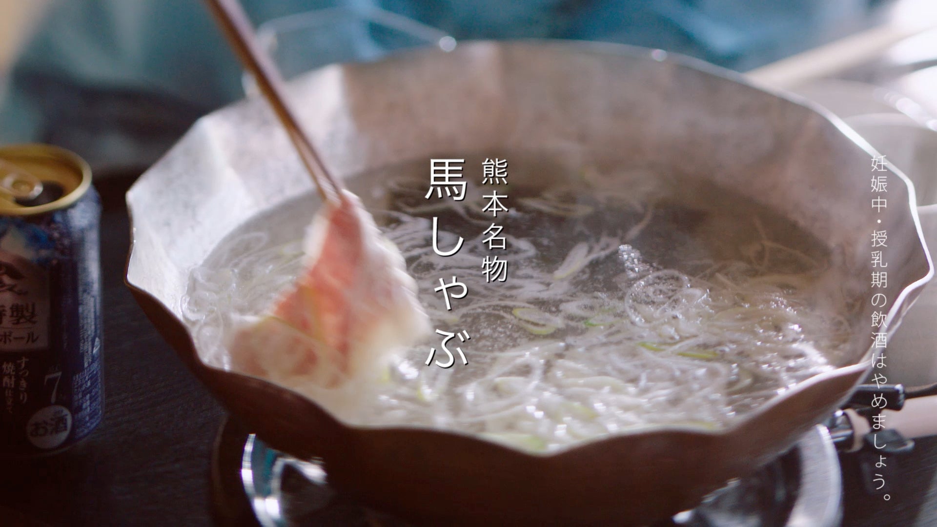 熊本に流れる球磨川(くまがわ)のほとりを思わせるような懐かしい雰囲気の料亭で、友人と共に“すっきり焼酎仕立て”の「麒麟特製 酎ハイボール」と熊本名物の「馬しゃぶ」を楽しむ内村さん。お酒と料理の相性に思わず内村さんも「うまか〜!」と熊本弁で唸ります。