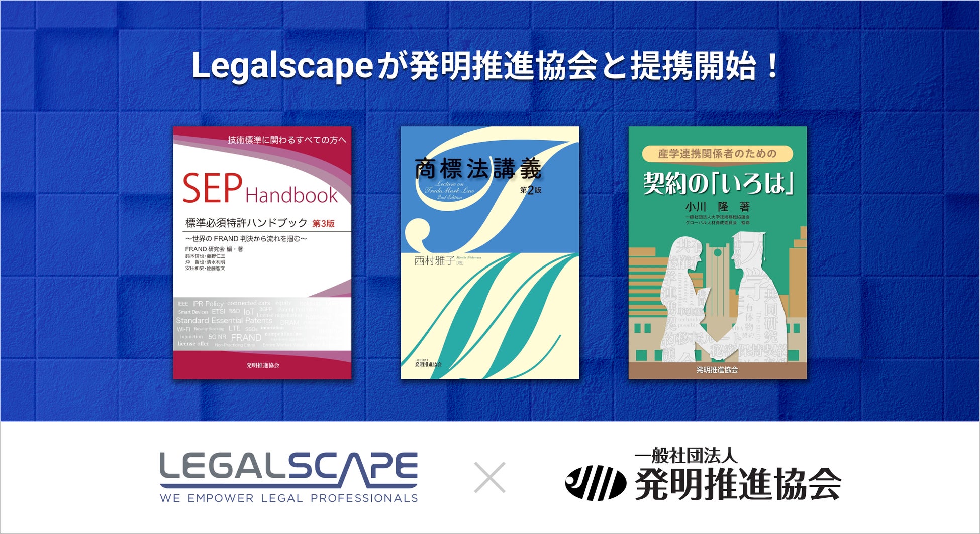 株式会社Legalscape(本社:東京都文京区 代表取締役社長・最高経営責任者:八木田 樹、以下リーガルスケープ)は、一般社団法人発明推進協会(東京都港区 会長:岩井 良行)と新たに提携し、書籍の掲載を開始したことをお知らせします。