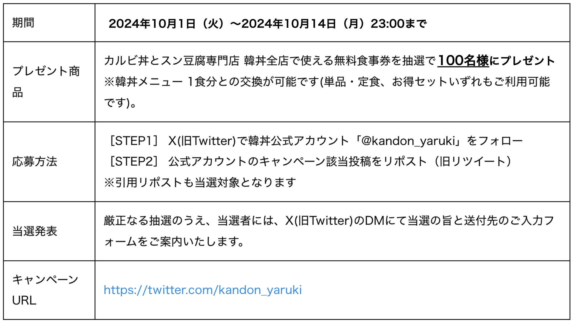 創業祭を記念して、韓丼で使える無料お食事券のプレゼントキャンペーンを実施いたします。応募方法はX(旧Twitter)にて、韓丼の公式アカウントをフォローし、対象のキャンペーン投稿をリポストするだけで応募完了です。どなたでも応募できますので、ぜひ奮ってご参加ください。