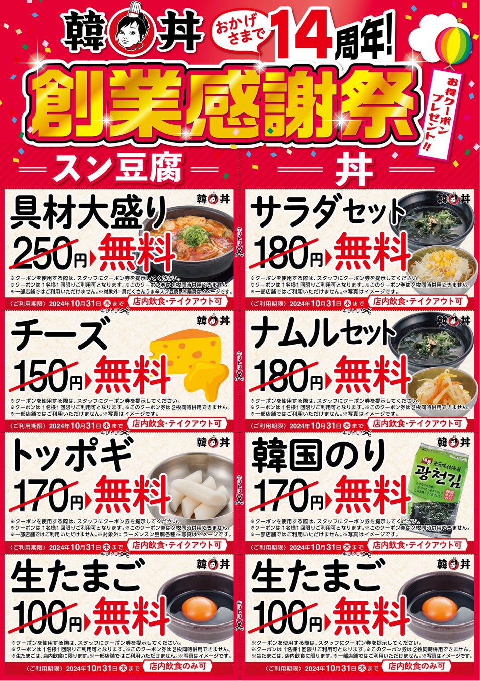 創業感謝祭を記念して、韓丼全店舗にてお得な無料クーポンを配布いたします。