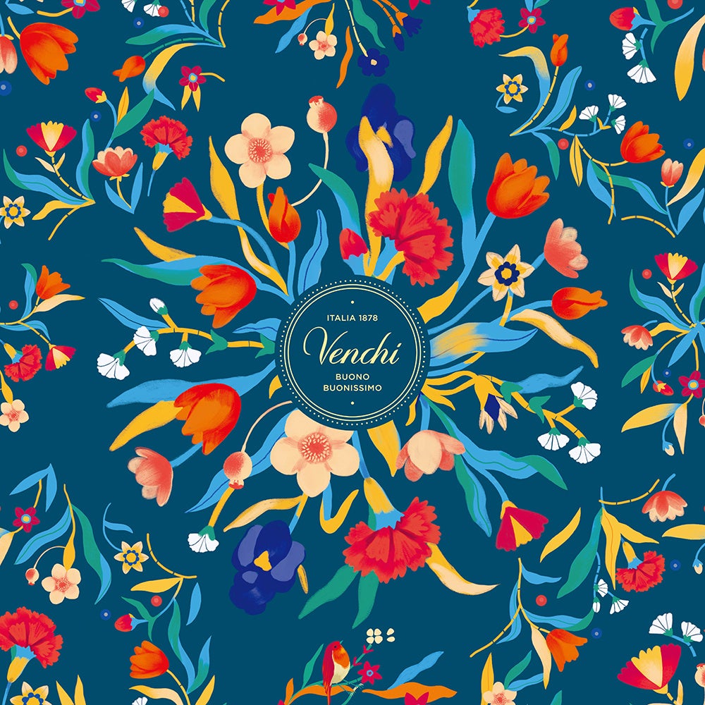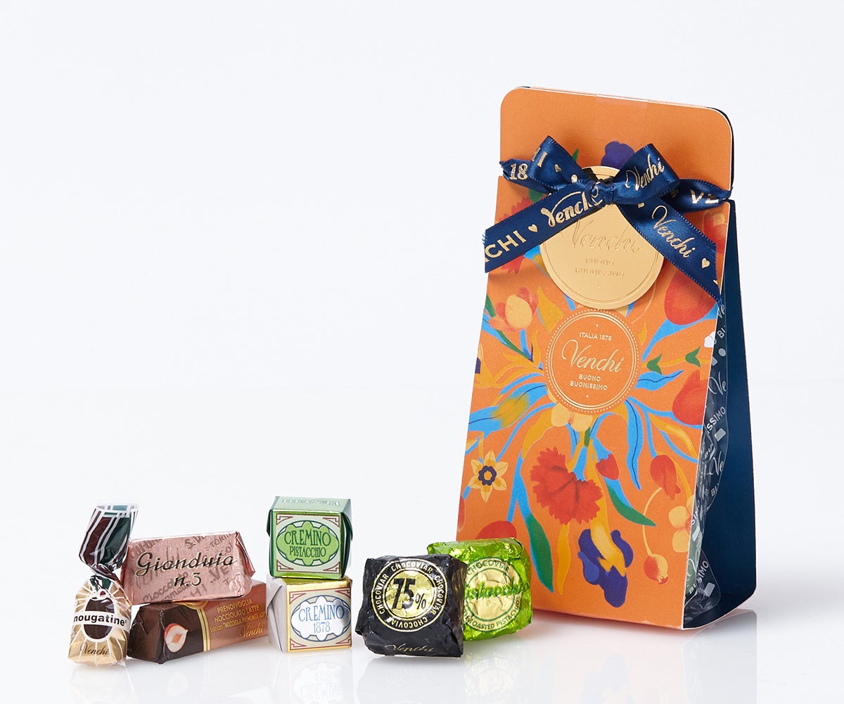 ヴェンキのアイコニックなチョコレート「チョコビア」4種類を詰め合わせたギフトセット。色とりどりの花が咲き誇る手のひらサイズのボックスにオレンジのリボンをかけてお届けします。