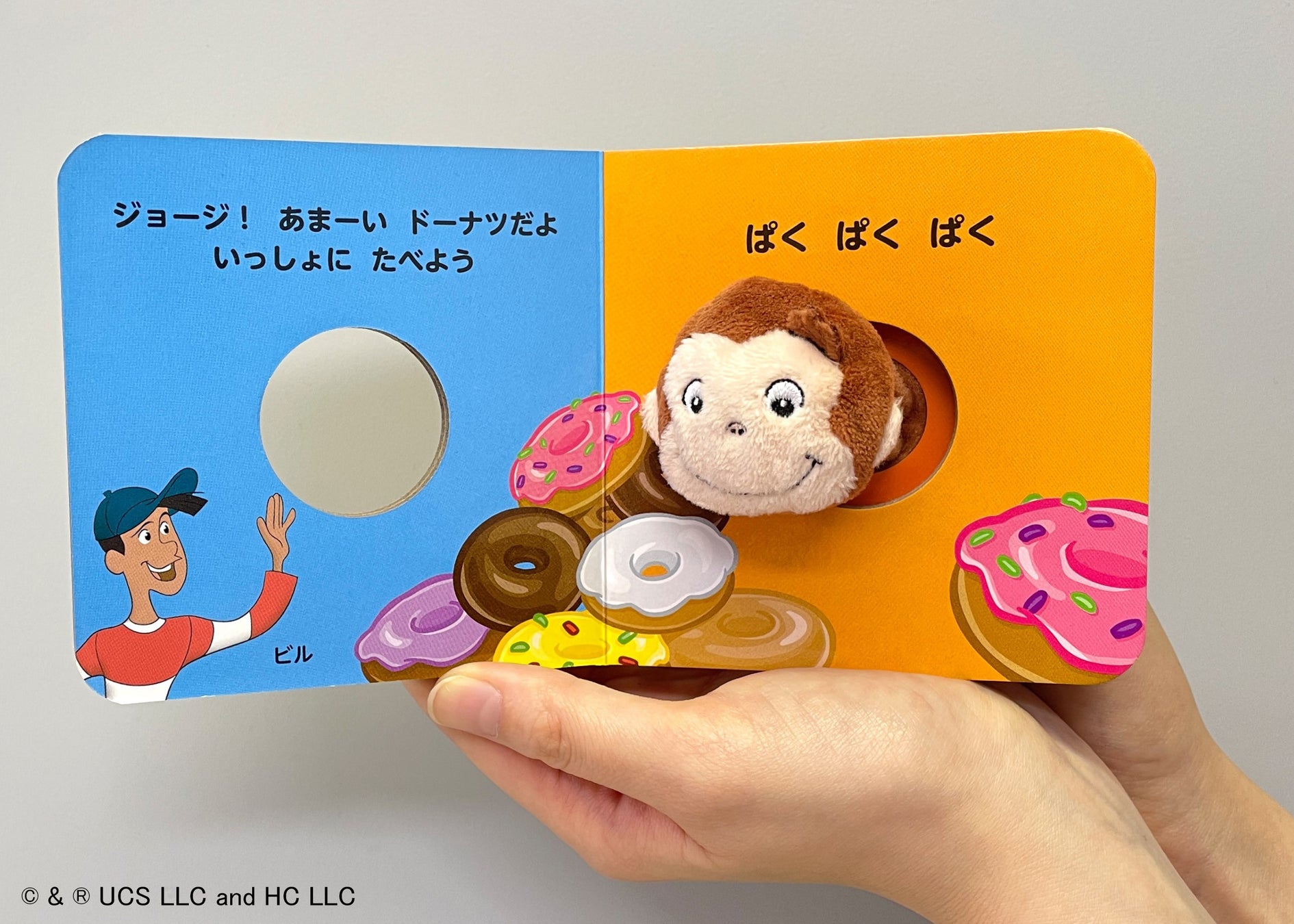 かわいいジョージのゆびにんぎょうがついた、ミニ絵本。全ページのまん中に穴があいていて、最後のページに、ジョージのにんぎょうがついています。後ろから指をさしこみ、にんぎょうをうごかしながら、絵本で遊べます。おうちではもちろん、帰省などの電車や車の中で、お子様が楽しく過ごすためのお伴にもおすすめです。